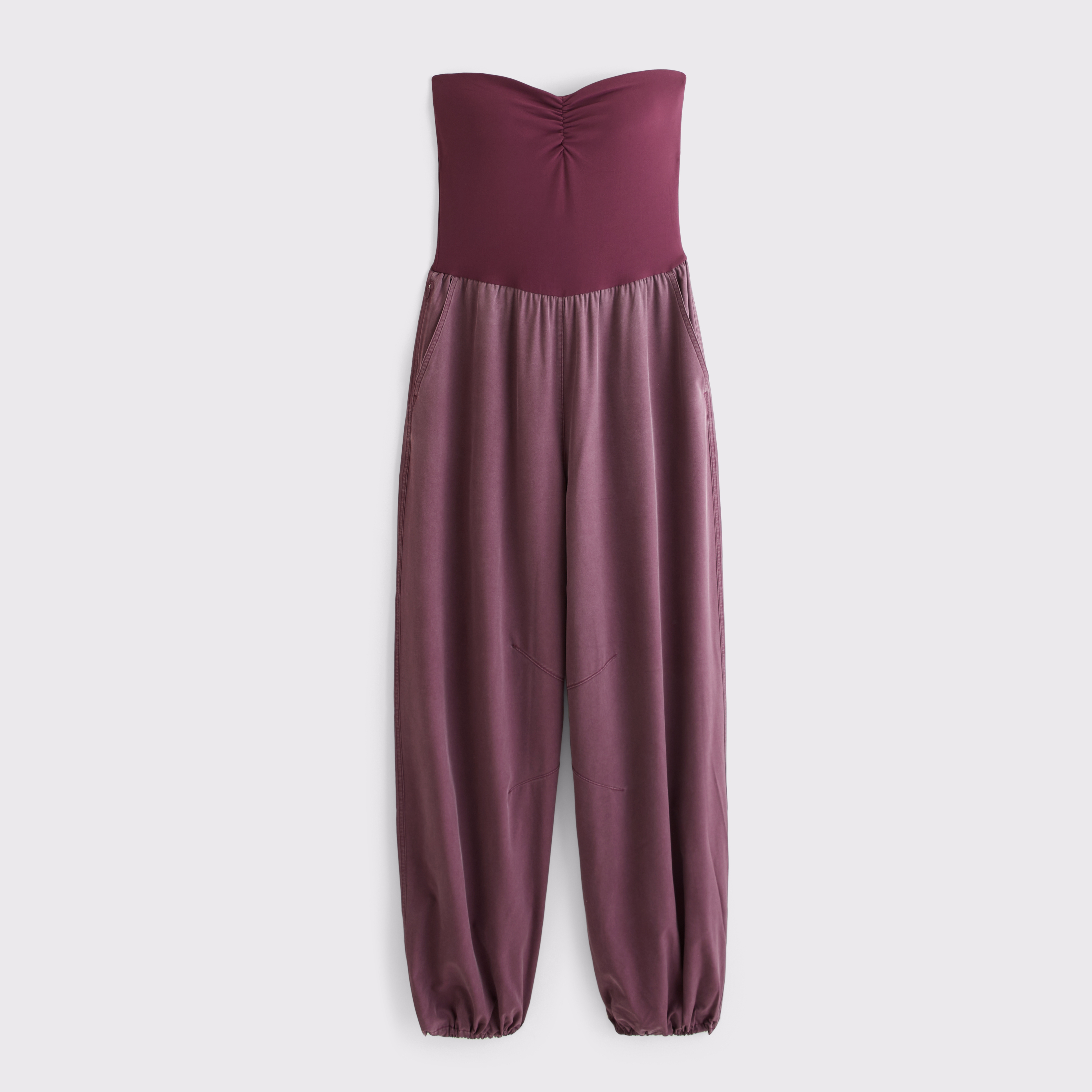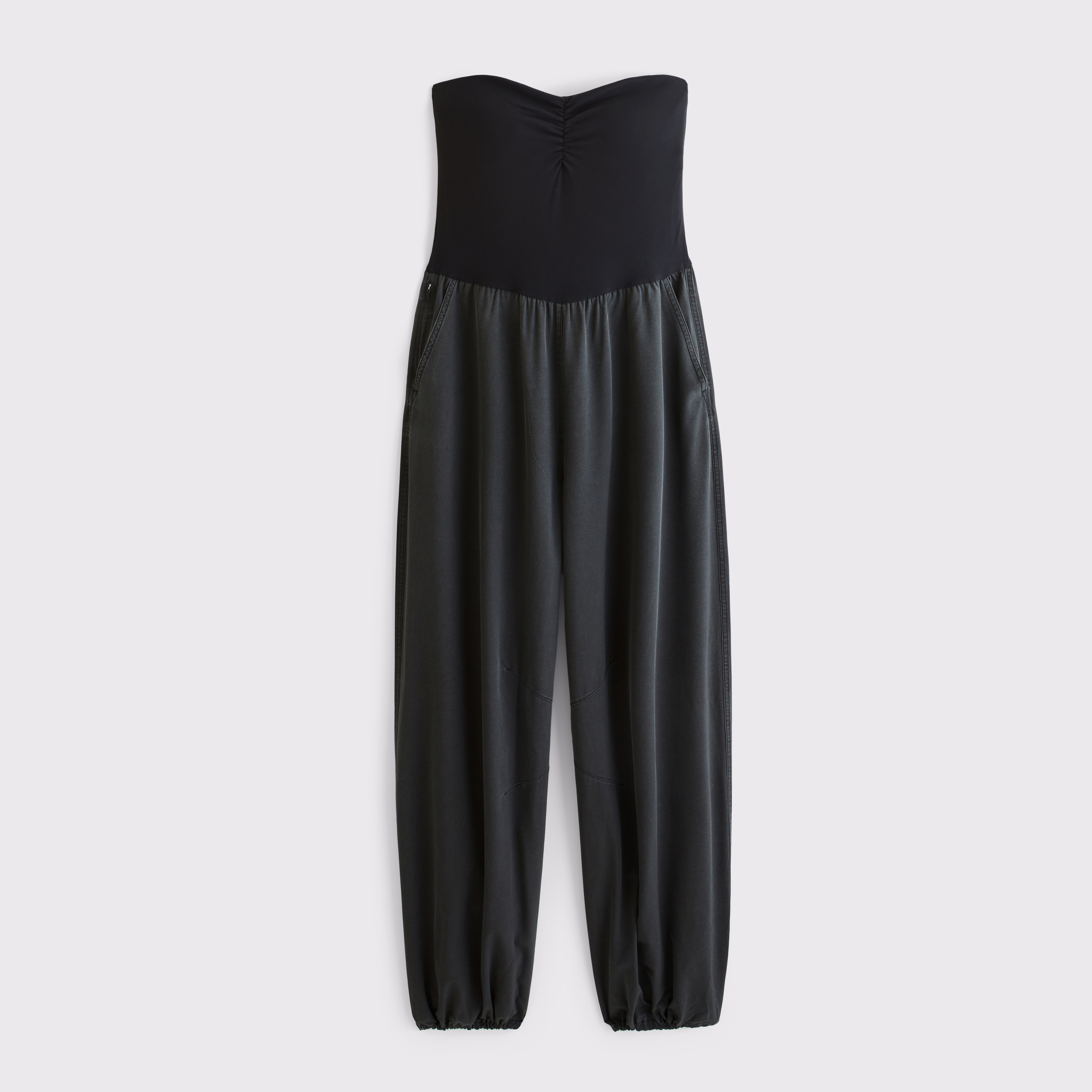Our easy-fitting active jumpsuit with a sculptLUX top and a motionTEK bottom. Features a bandeau-style neckline, removable straps, a balloon-leg silhouette with adjustable ties at the hem to convert to a wide leg, pockets and a built-in shelf bra with removable pads. Imported.