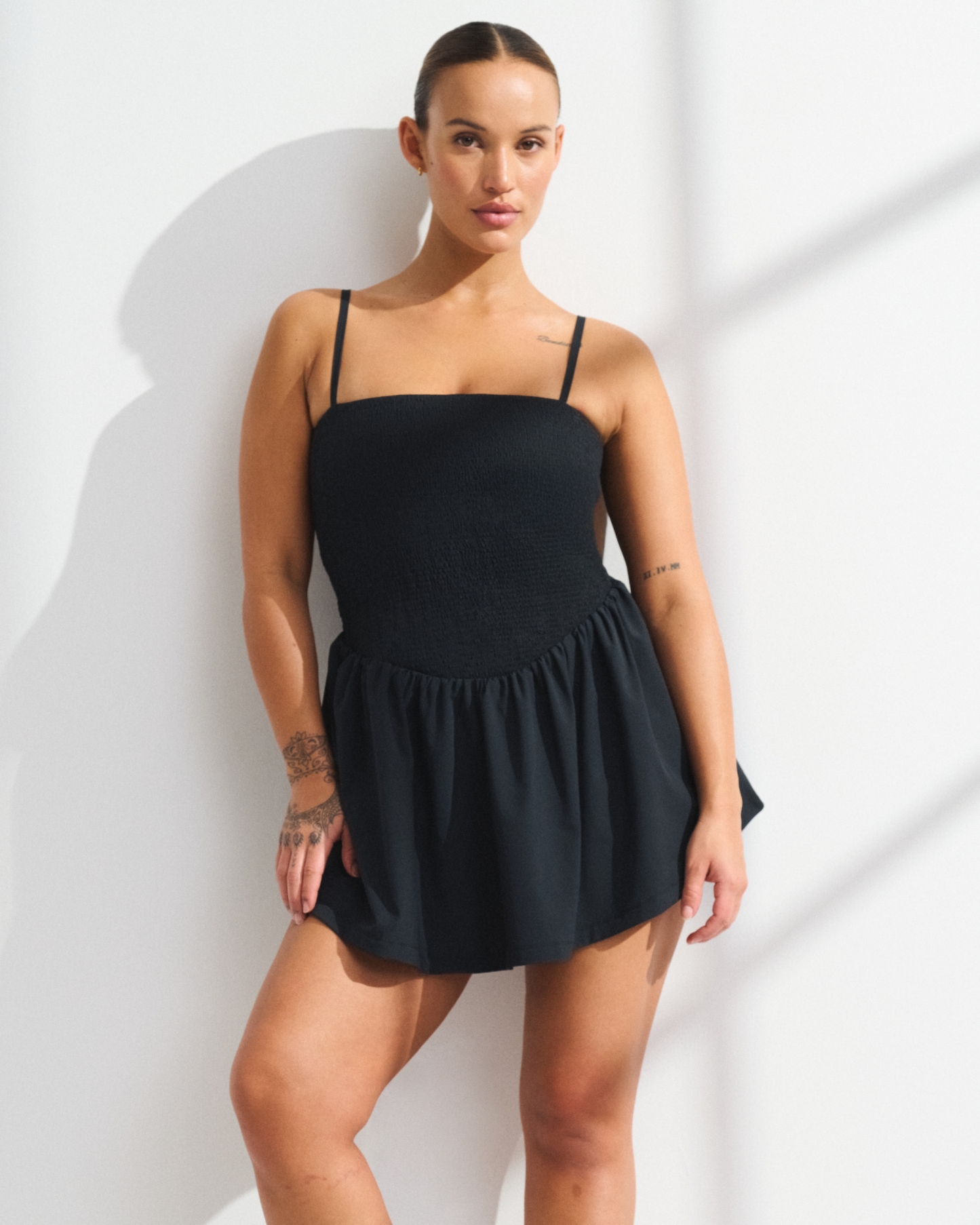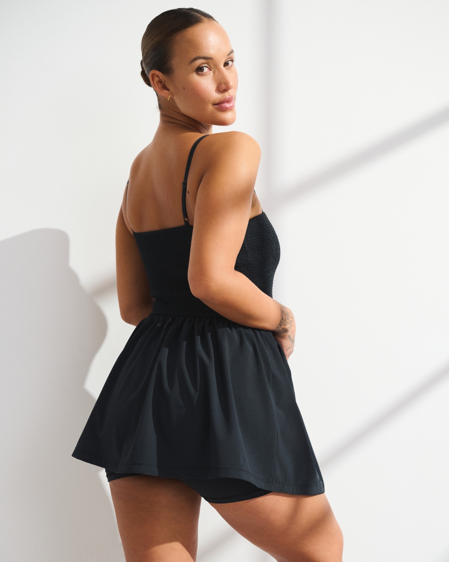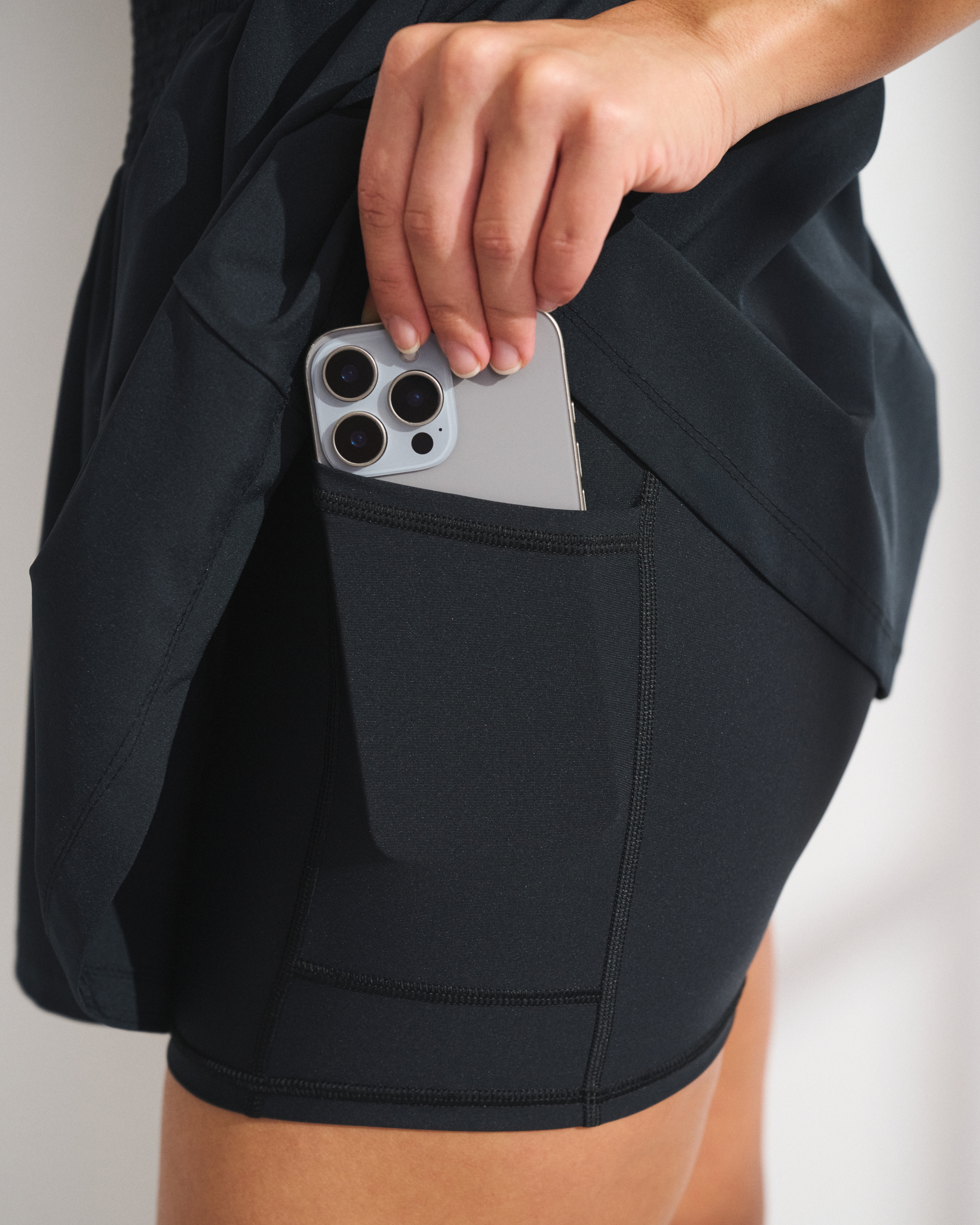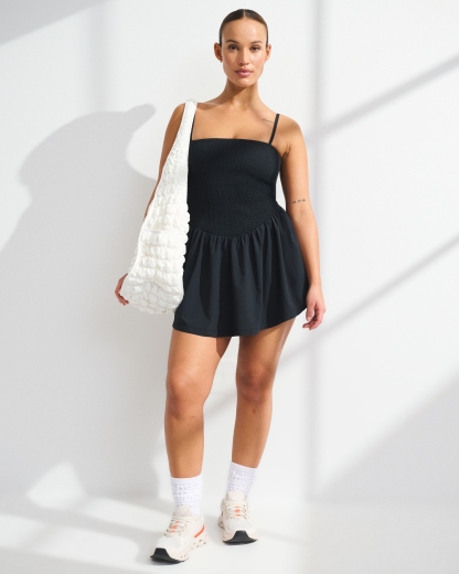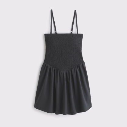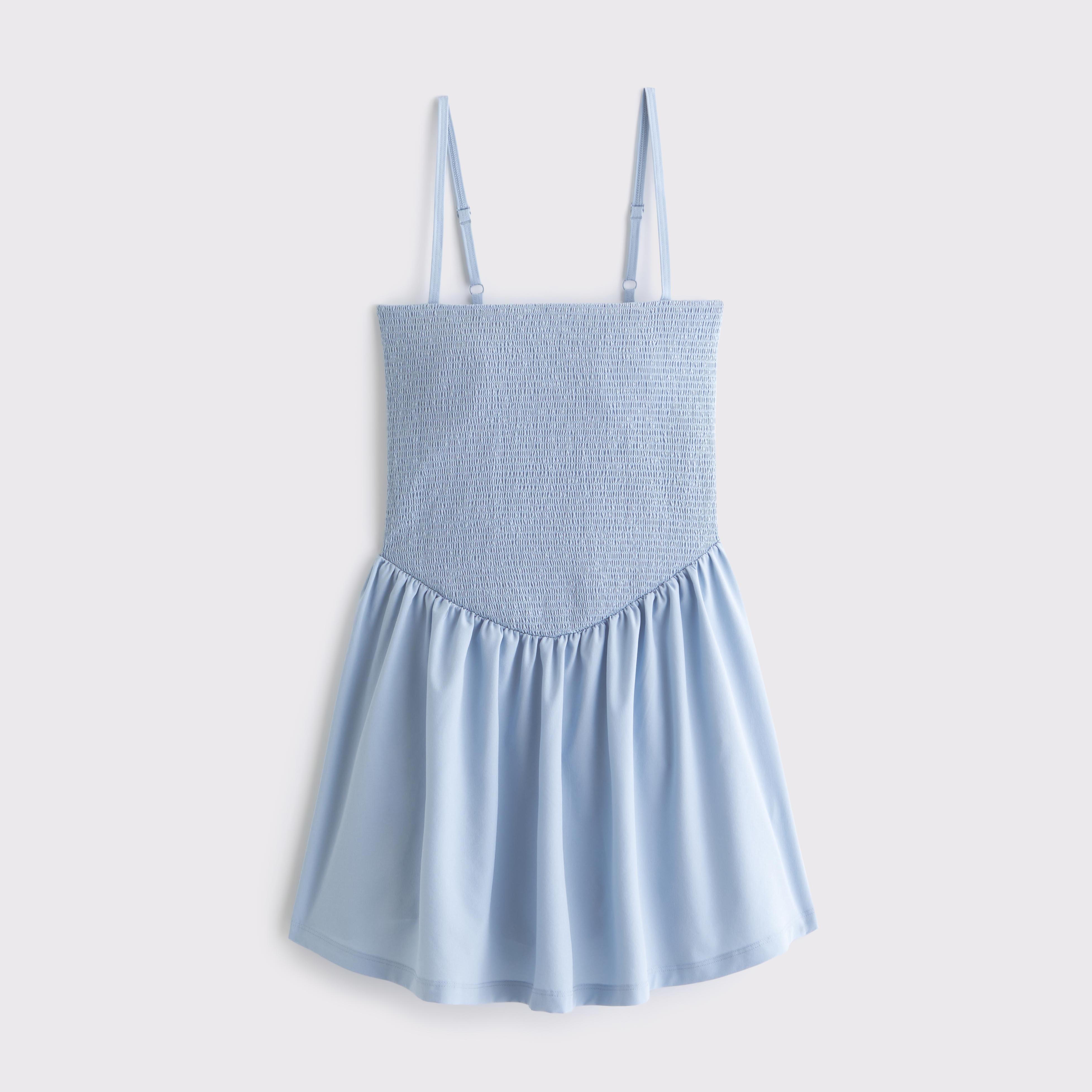 Our active mini dress in our motionTEK active fabric. Designed to move with you, our motionTEK fabric is lightweight, stretchy, moisture-wicking and breathable. Features our bathroom-friendly liner with a stretch interior lining, smocking details along the bodice, a straight neckline and a built-in shelf bra with removable pads. Features shorts with a new pull-down feature designed to make all-day wear easier than ever. Imported.