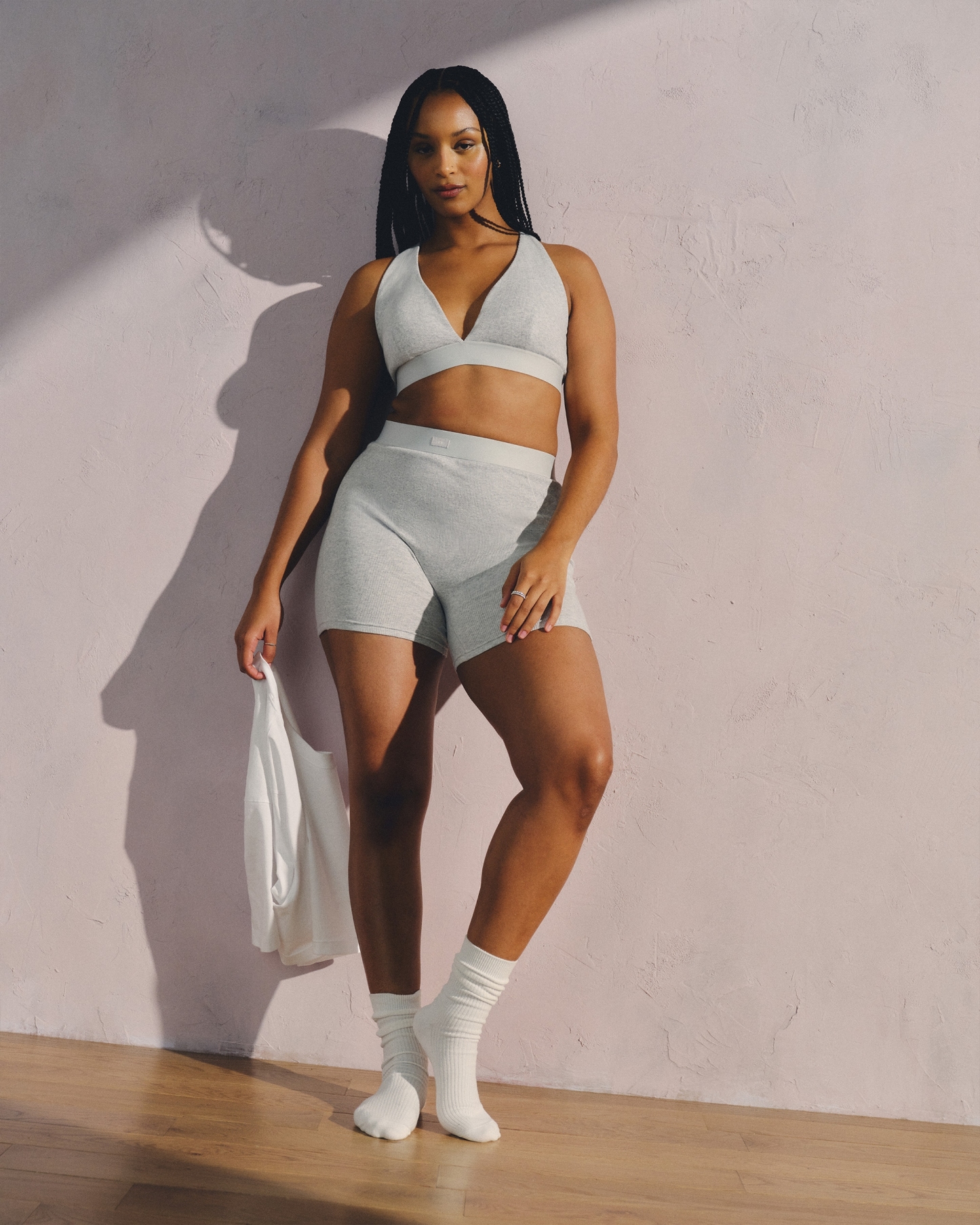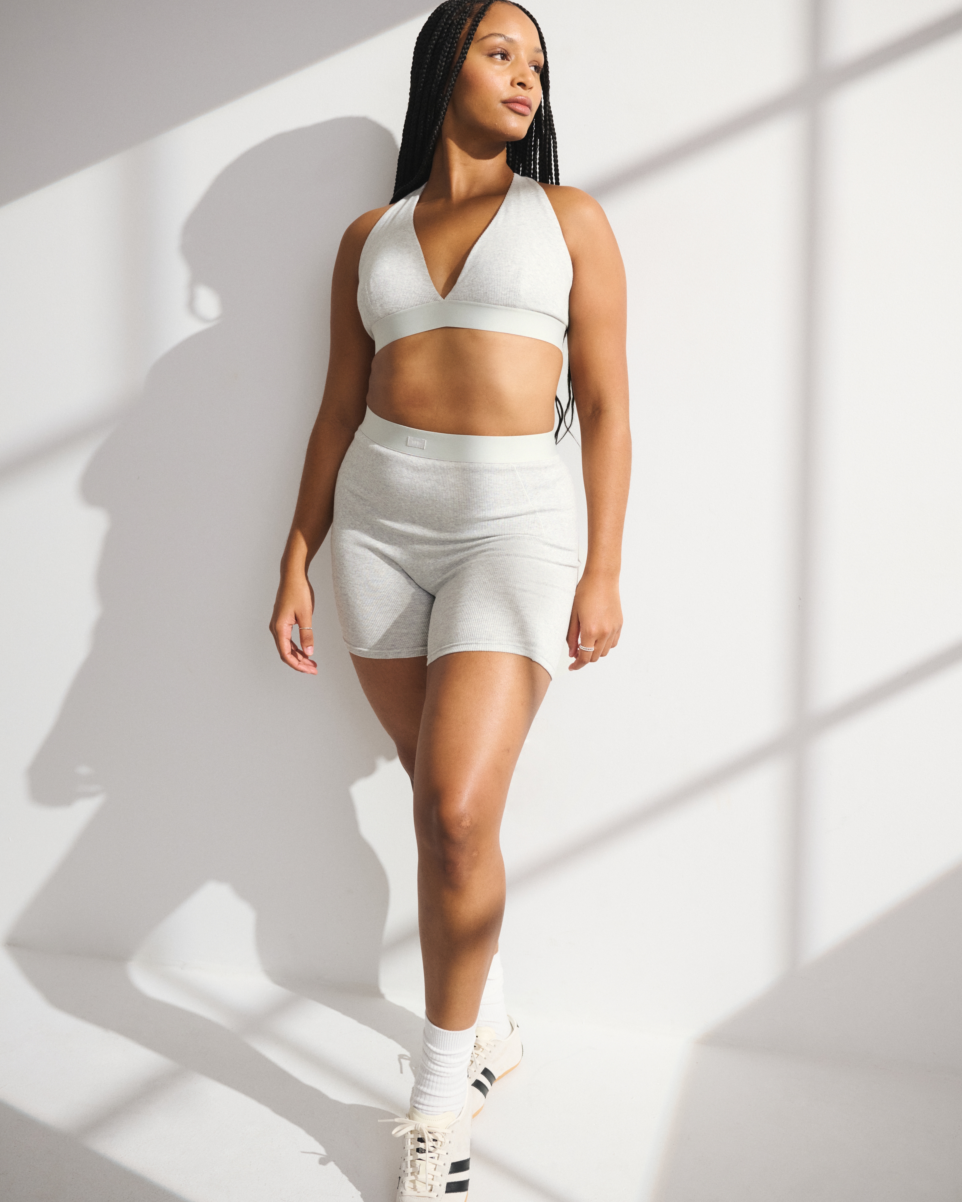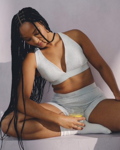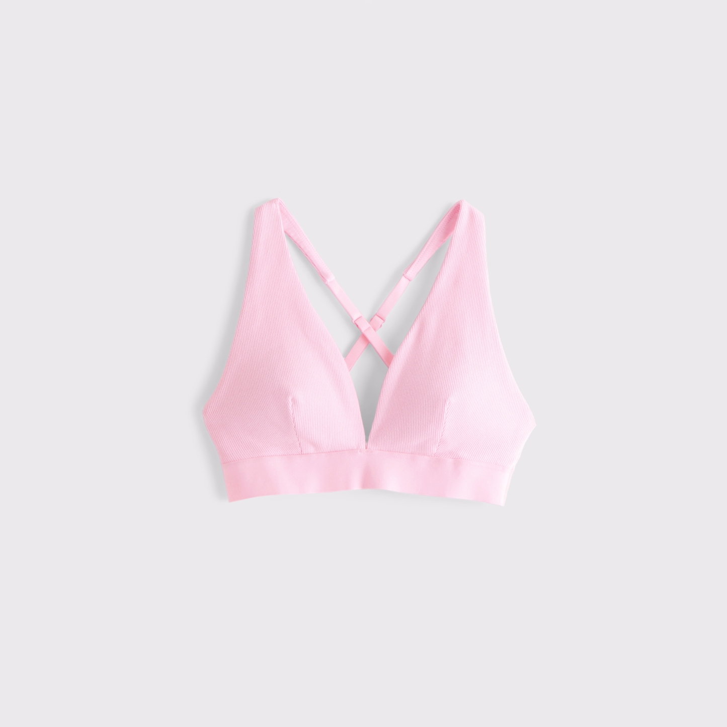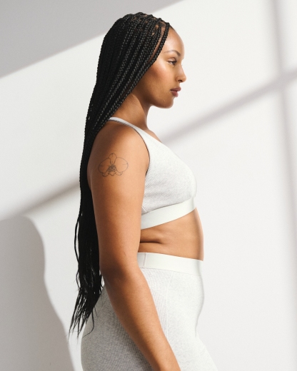 Our lounge bra in our active superSOFT rib fabric and core length. Our superSOFT rib fabric is ribbed and velvety on the outside for a cozy feel with a cooling, smooth interior lining that keeps you comfortable. Features adjustable cross-back straps, removable pads, all-over ribbed detail and a plunging V-neckline. Imported.
