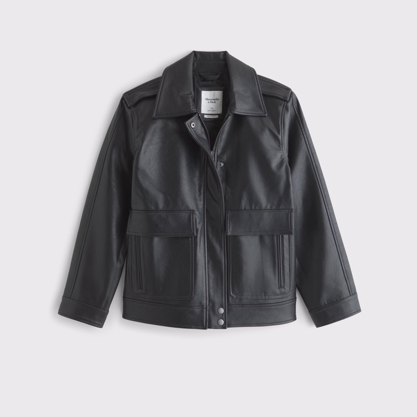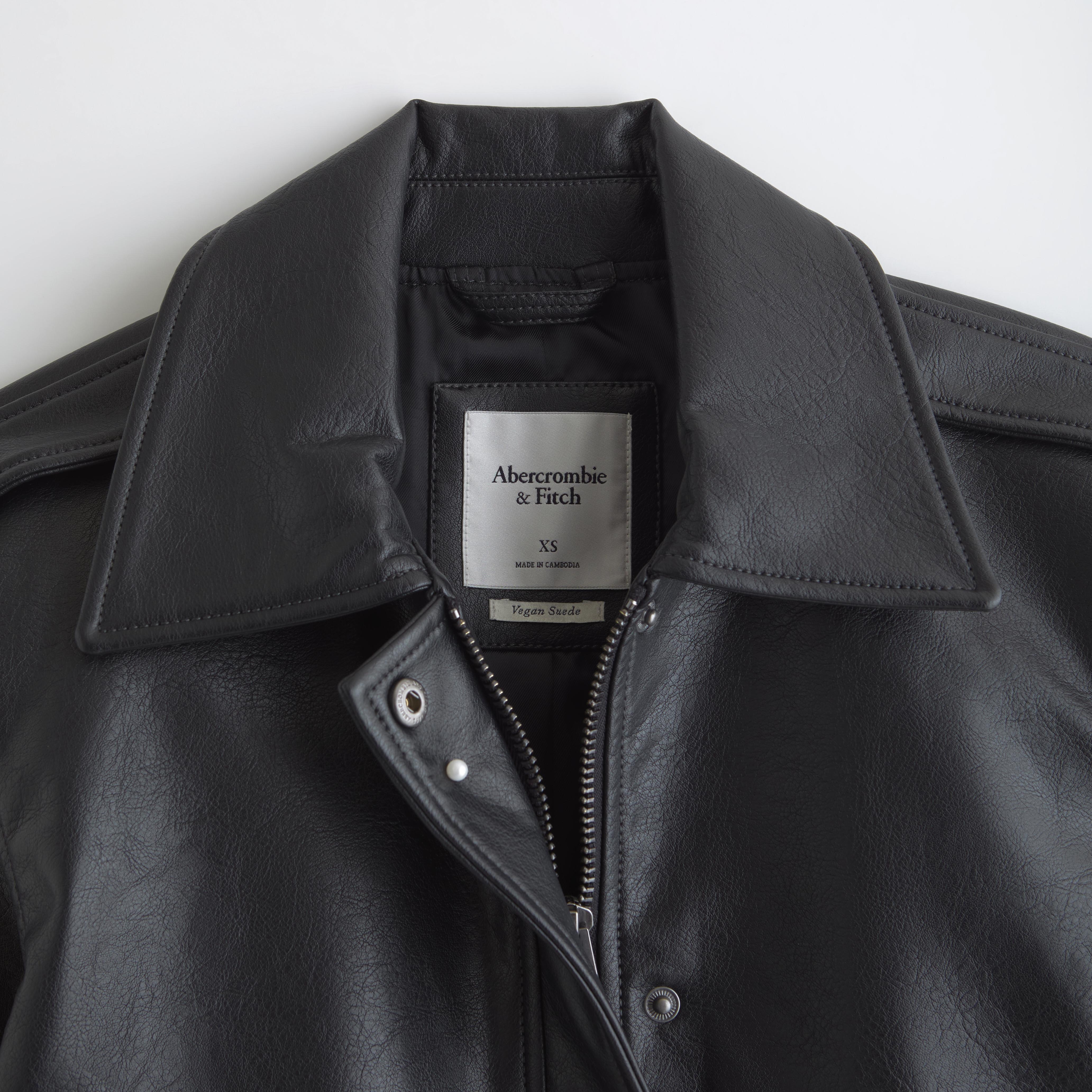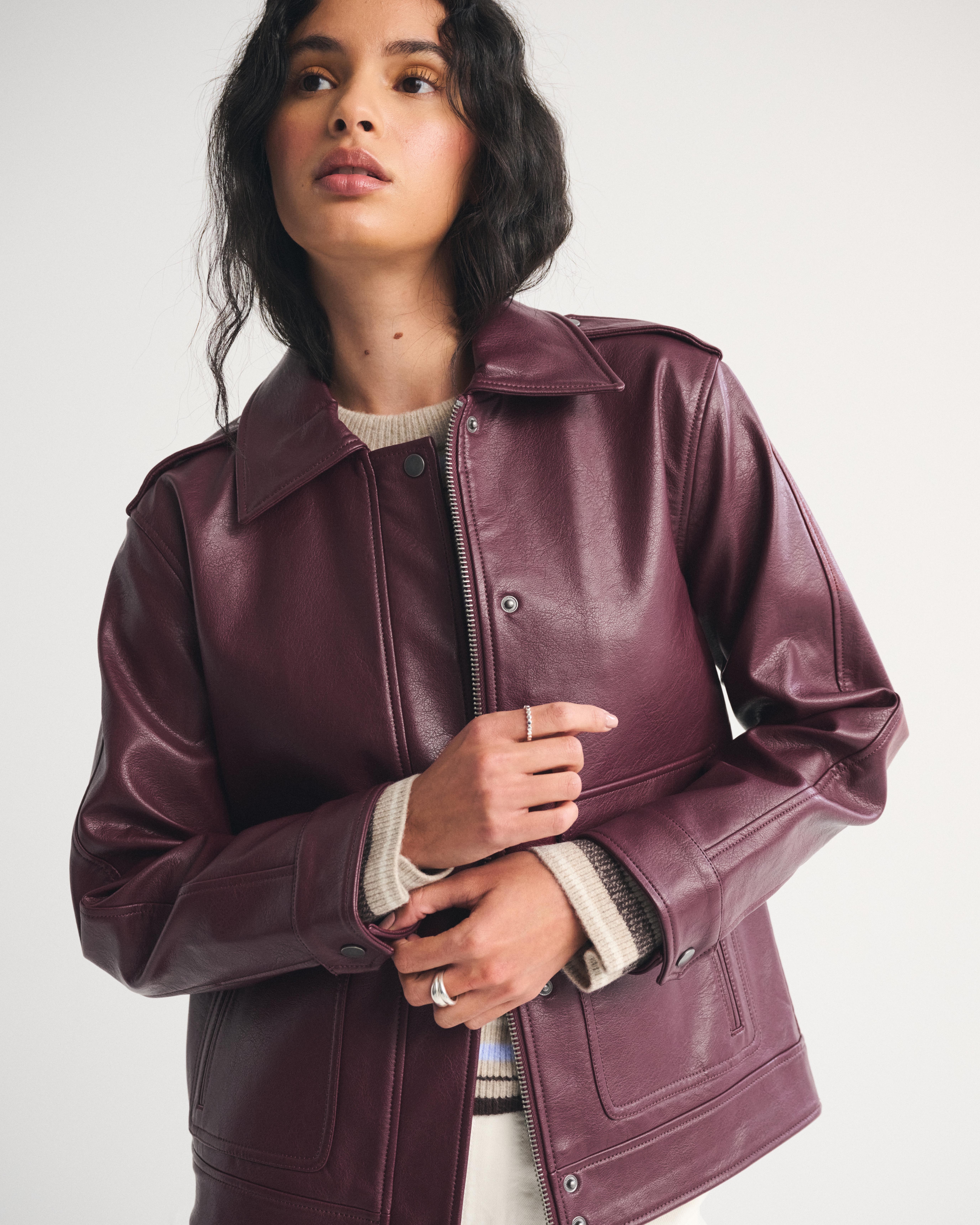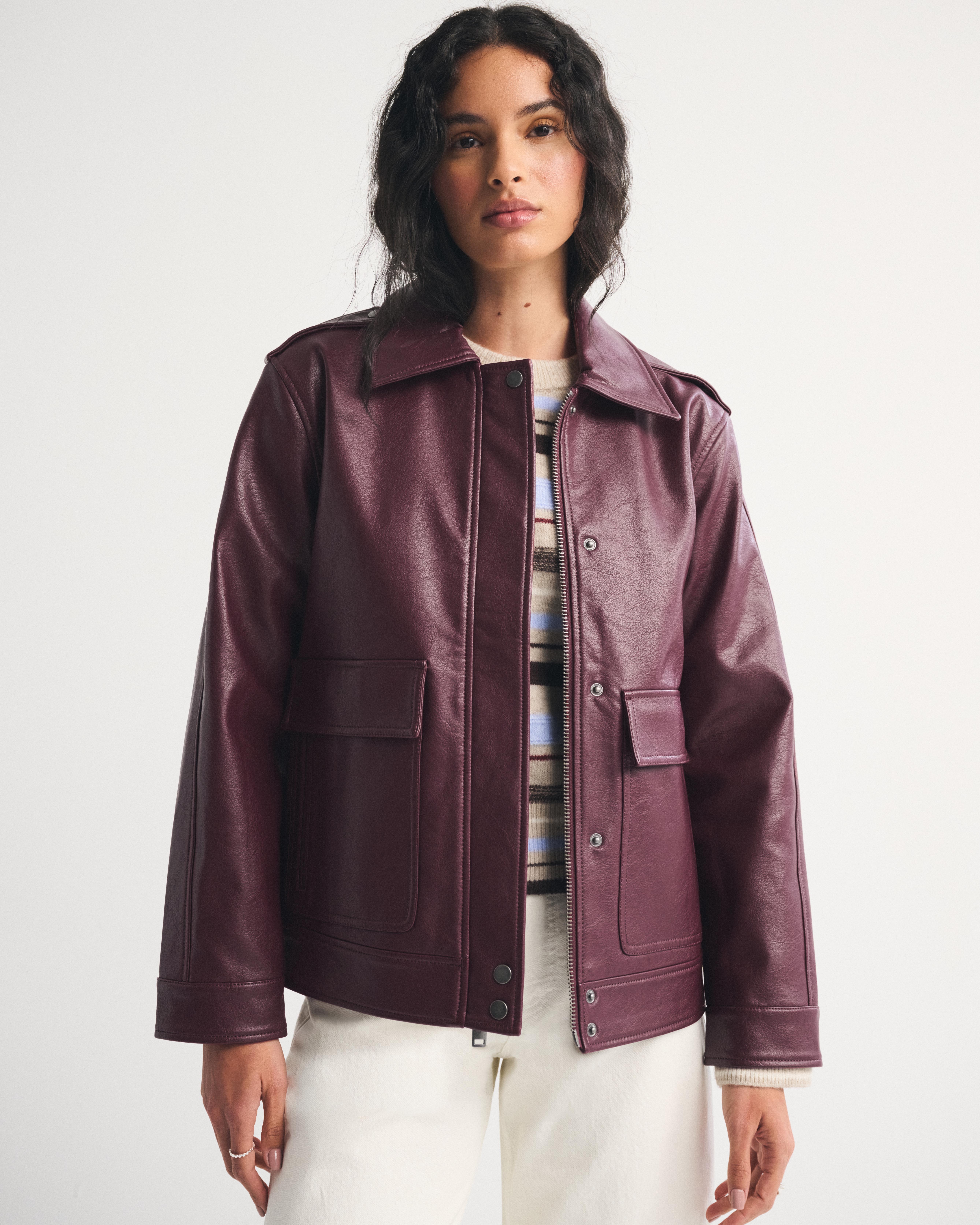 Our comfortable jacket in a relaxed, straight-cut silhouette and our soft vegan leather fabric. Features a classic fold down collar, zip-and-snap up front closure, and front patch pockets with side entry. Imported.