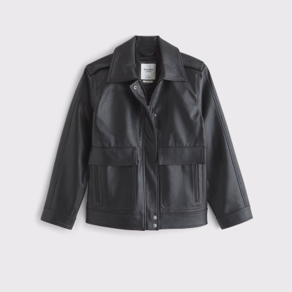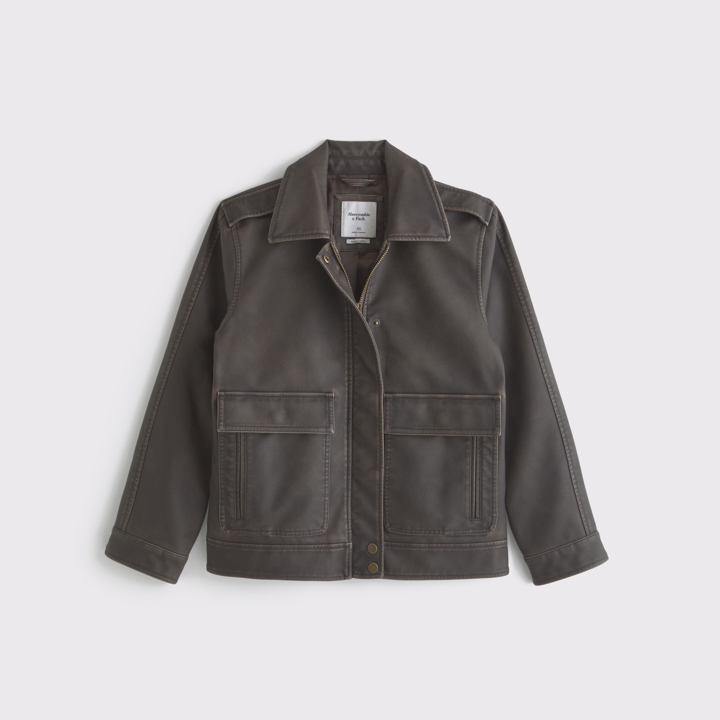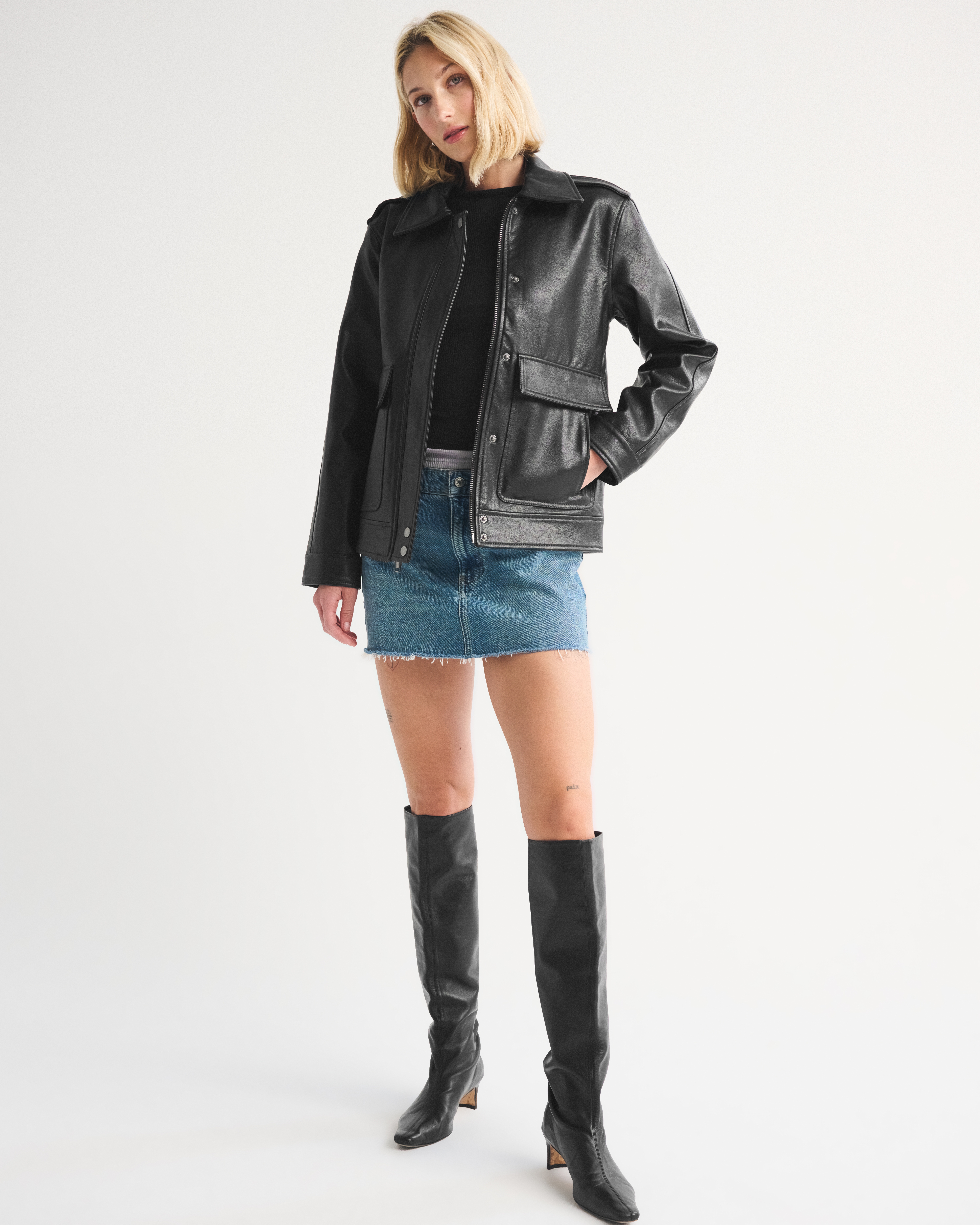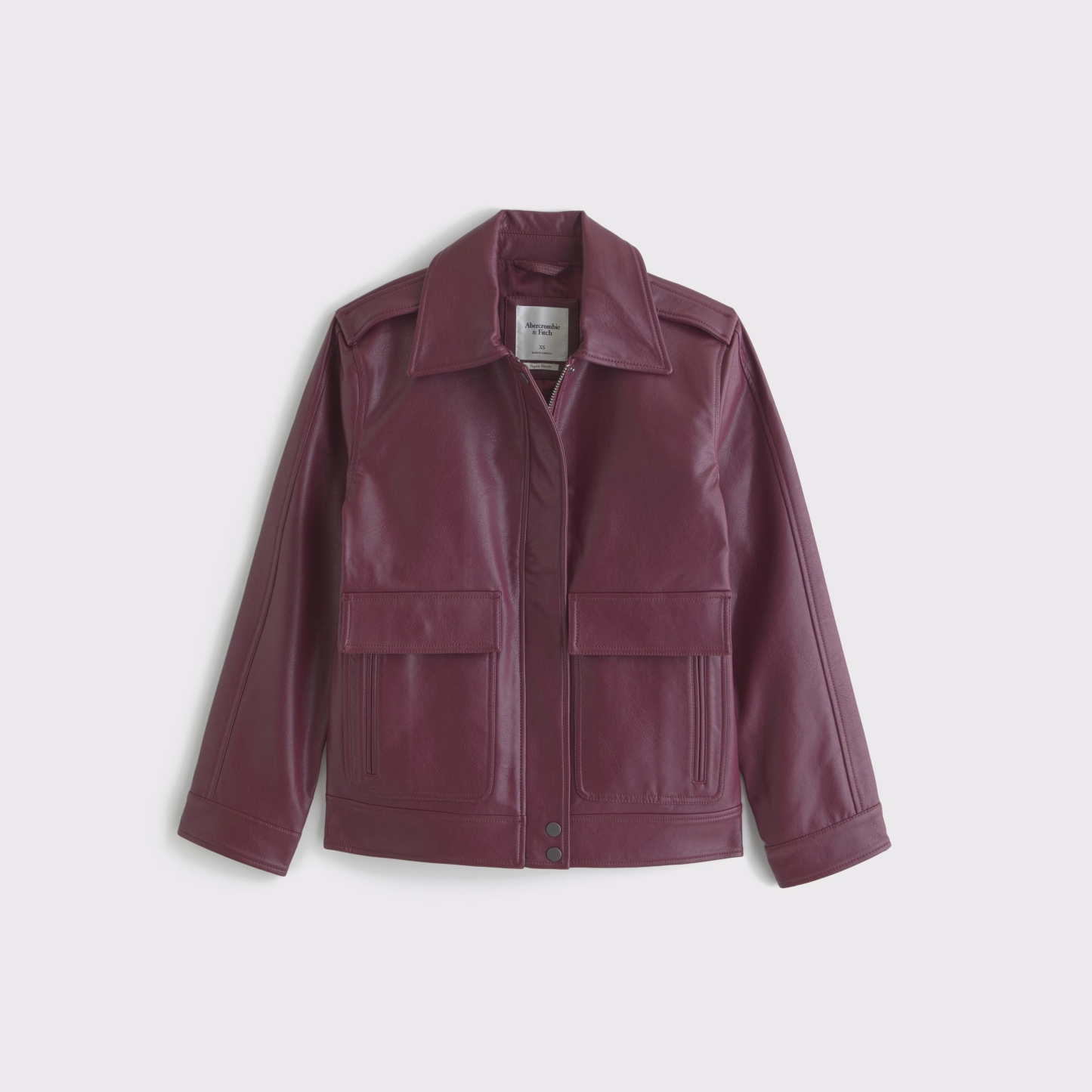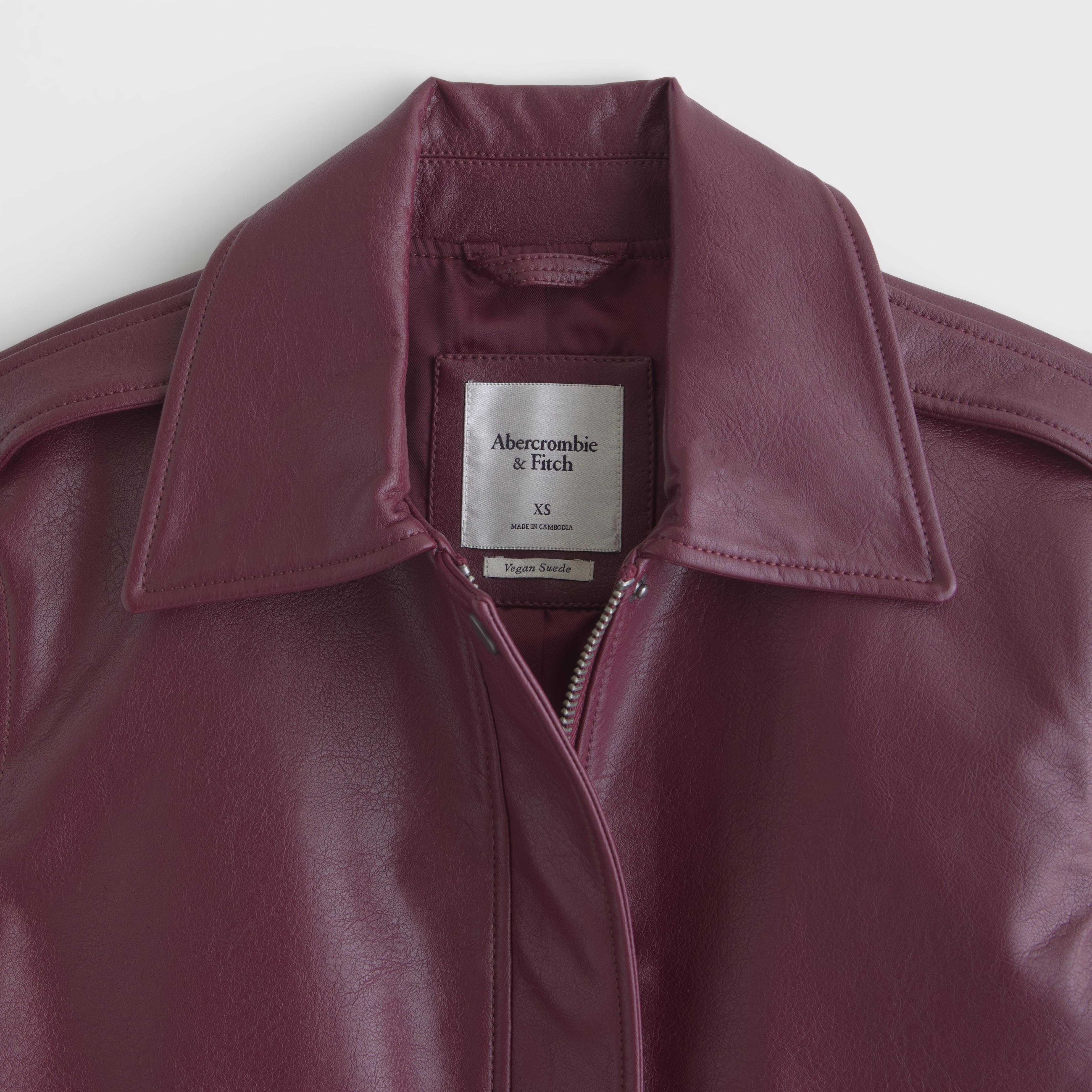 Our comfortable jacket in a relaxed, straight-cut silhouette and our soft vegan leather fabric. Features a classic fold down collar, zip-and-snap up front closure, and front patch pockets with side entry. Imported.