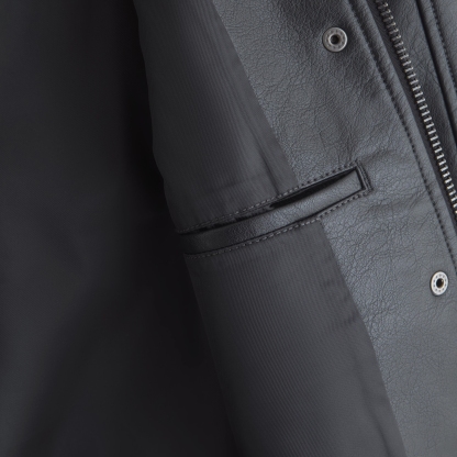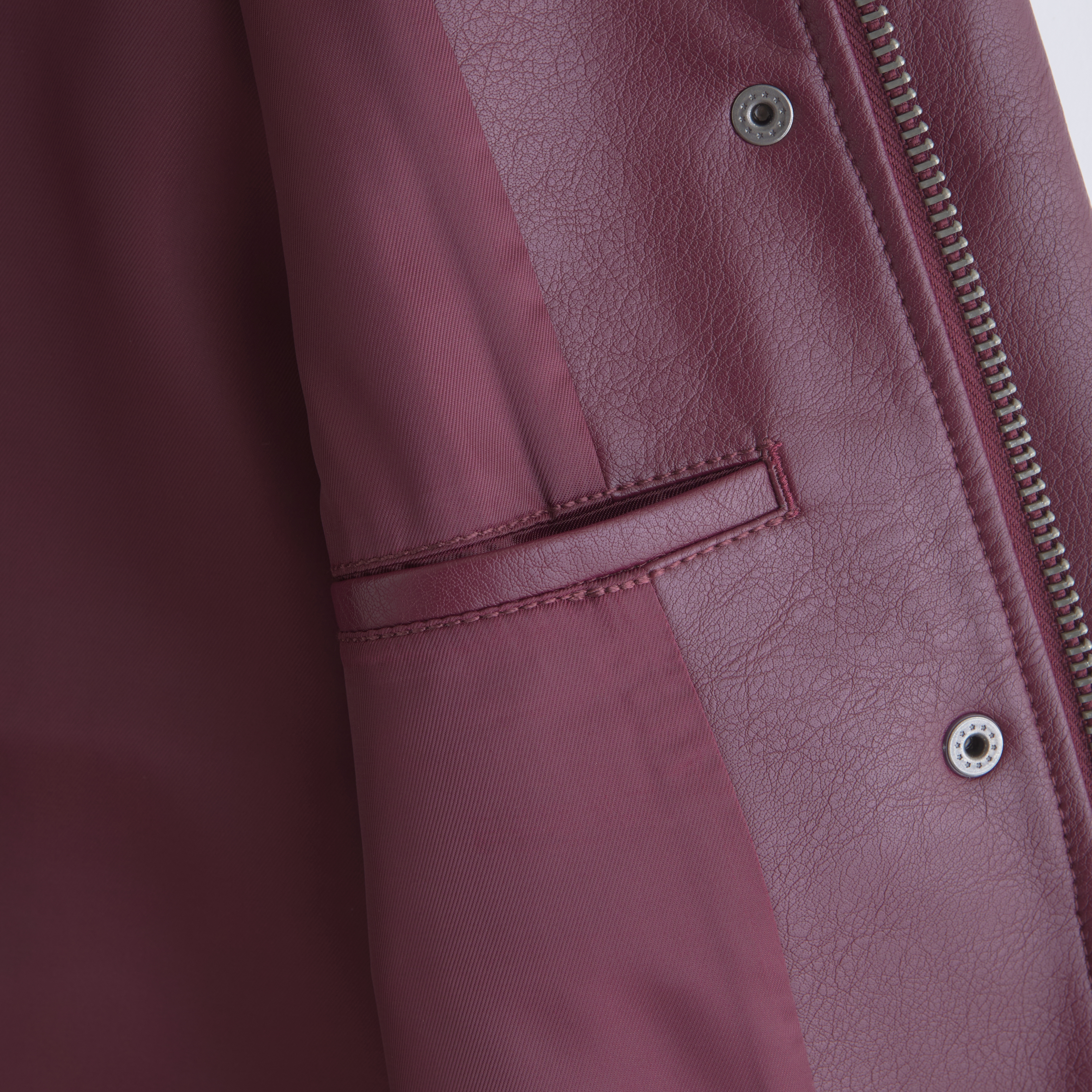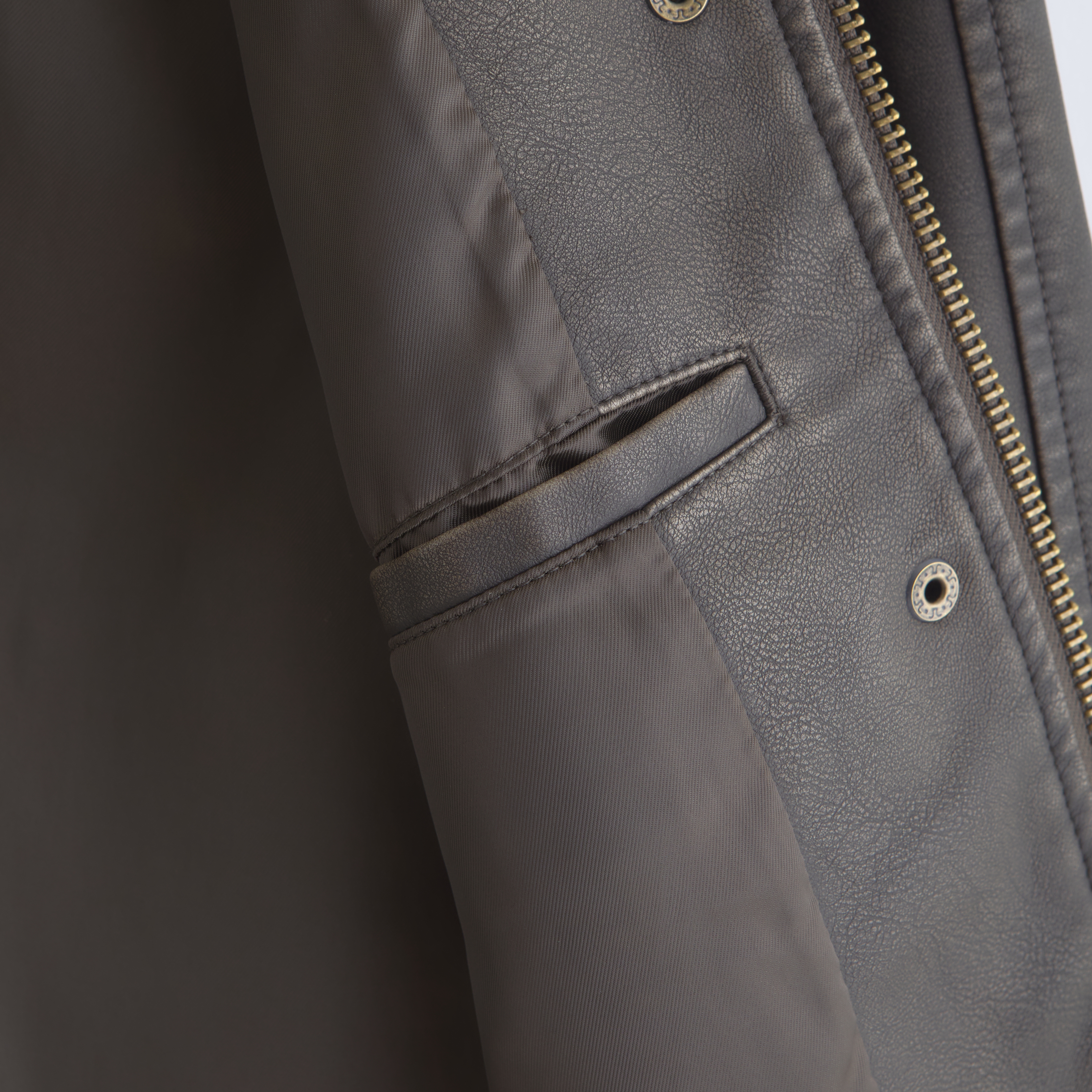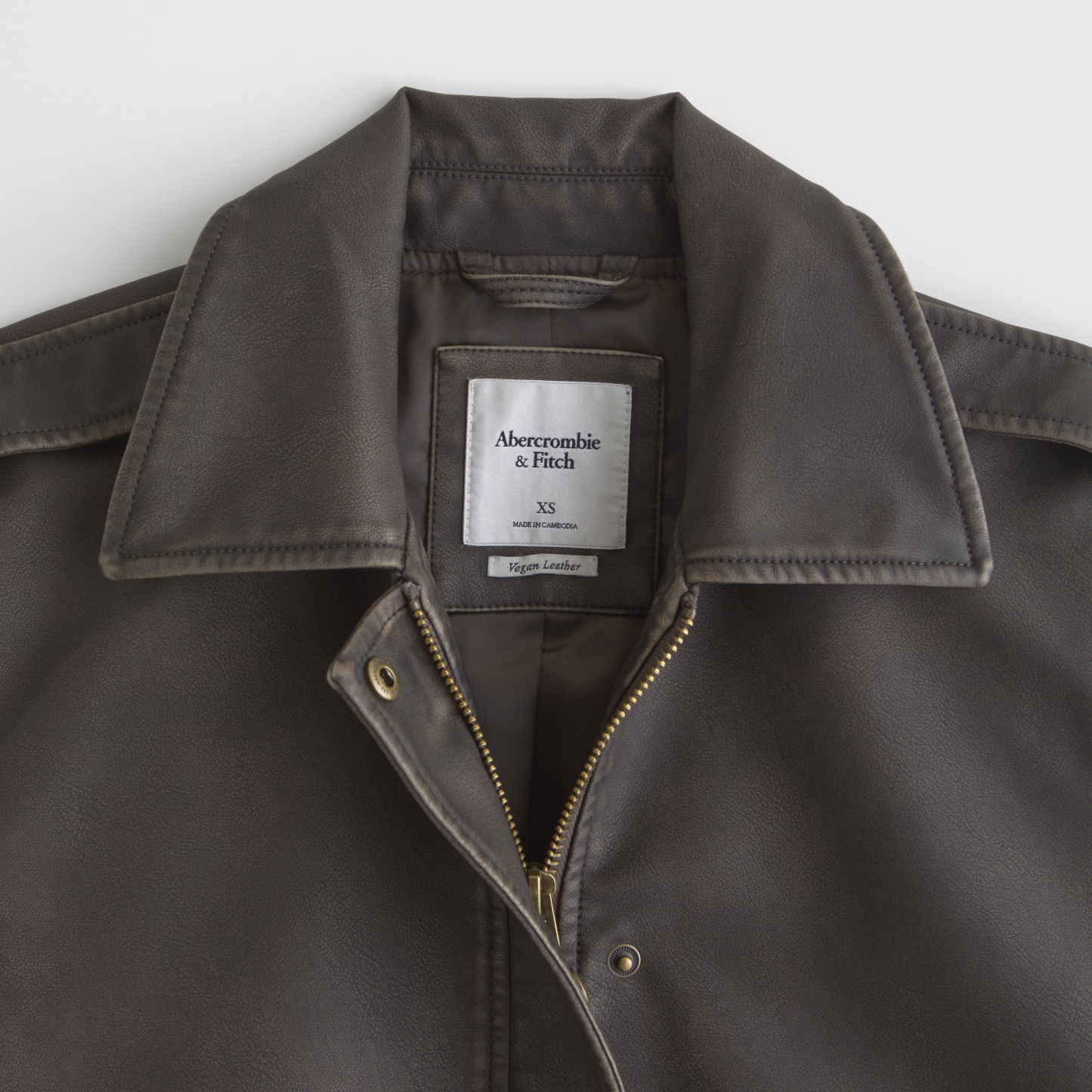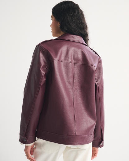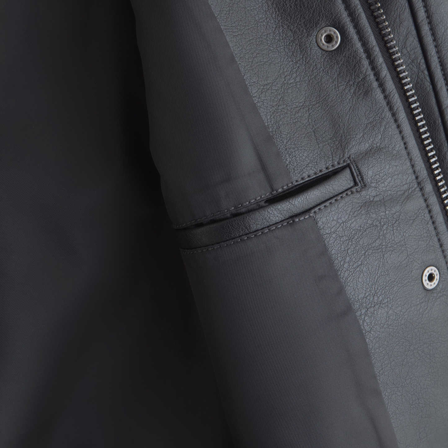 Our comfortable jacket in a relaxed, straight-cut silhouette and our soft vegan leather fabric. Features a classic fold down collar, zip-and-snap up front closure, and front patch pockets with side entry. Imported.
