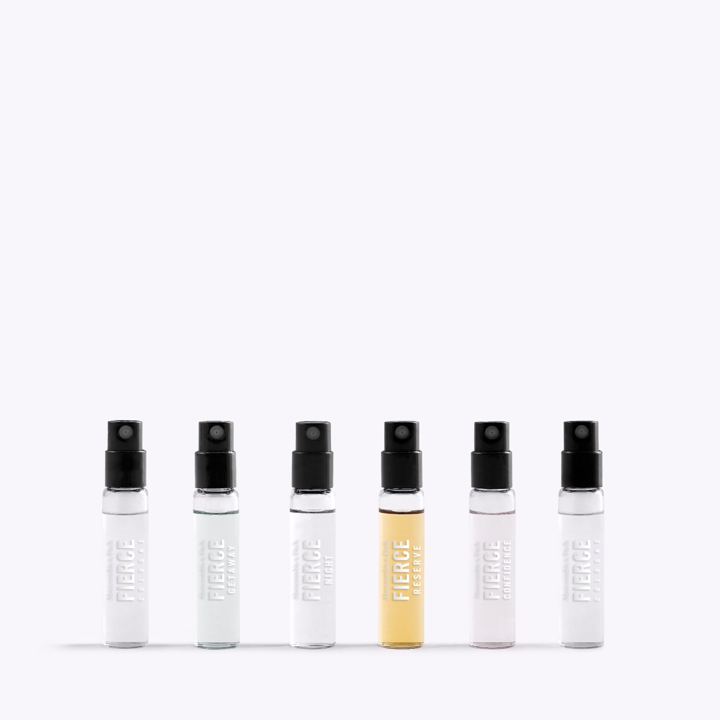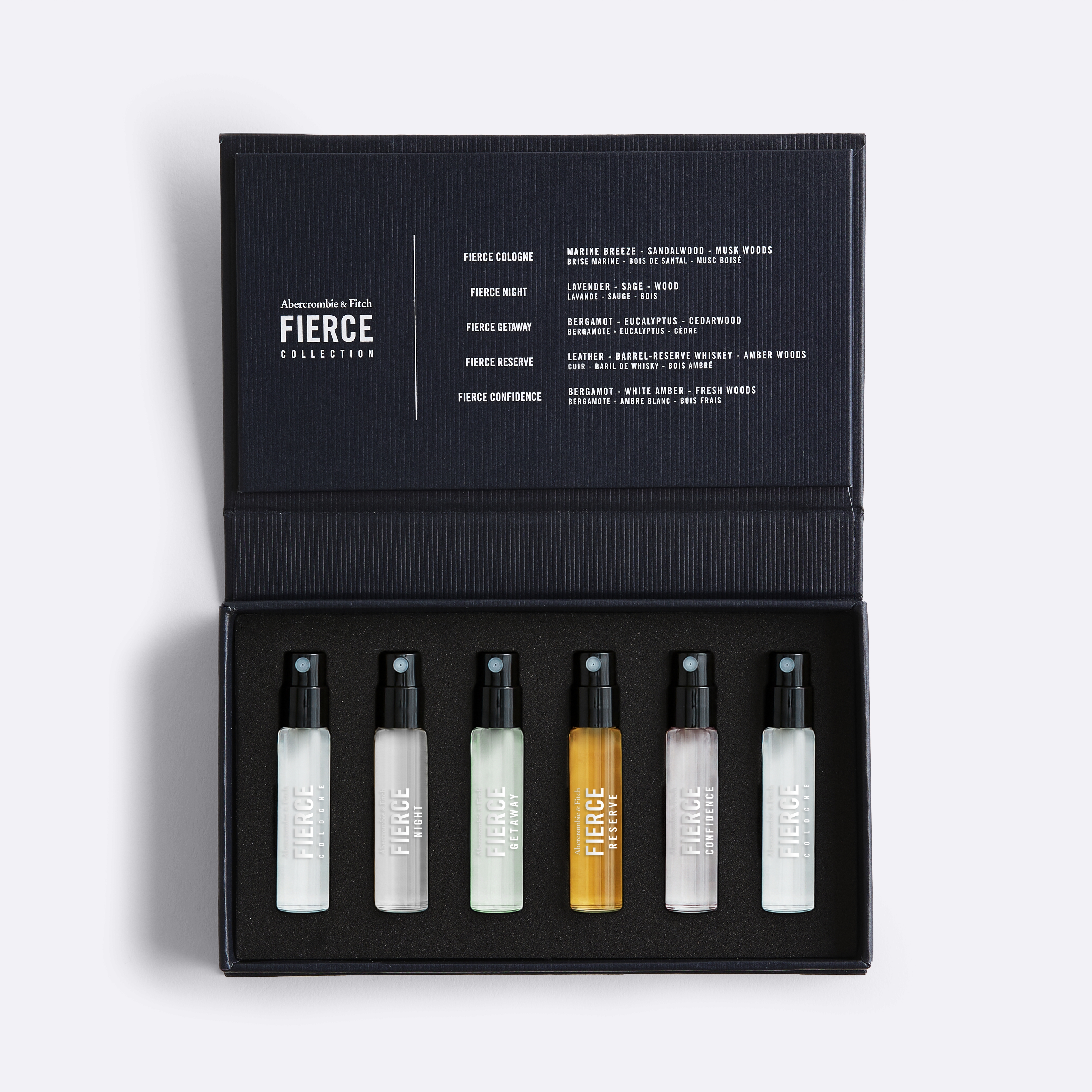 Our new discovery kit features a collection of seven 0.08 travel-size sampler vials of our newest A&F Fragrance Suite, including Fierce Cologne, Fierce Night, Fierce Getaway, Fierce Reserve and Fierce Confidence. Fierce features a blend of marine breeze, sandalwood and sensual musk wood notes, for a fragrance that’s truly iconic. Fierce Night features an aromatic blend of lavender and zesty bergamot that brings forward crushed herbs and creamy woods for an invigorating fragrance - and night - you'll never forget. Fierce Getaway features a serene blend of sunny bergamot, fresh eucalyptus and cedarwood highlight an unmistakable new scent blended for your next escape. Fierce Reserve features a rich aroma with notes of wild sage, aged leather, crisp amber and barrel-reserved whiskey. Fierce Confidence features a blend of bergamot, white amber and musk notes, for a fragrance that is truly unmistakable. Dermatologist tested. Contains alcohol. Fragrance can ship to US, CA, CN, HK, UK and most European countries.