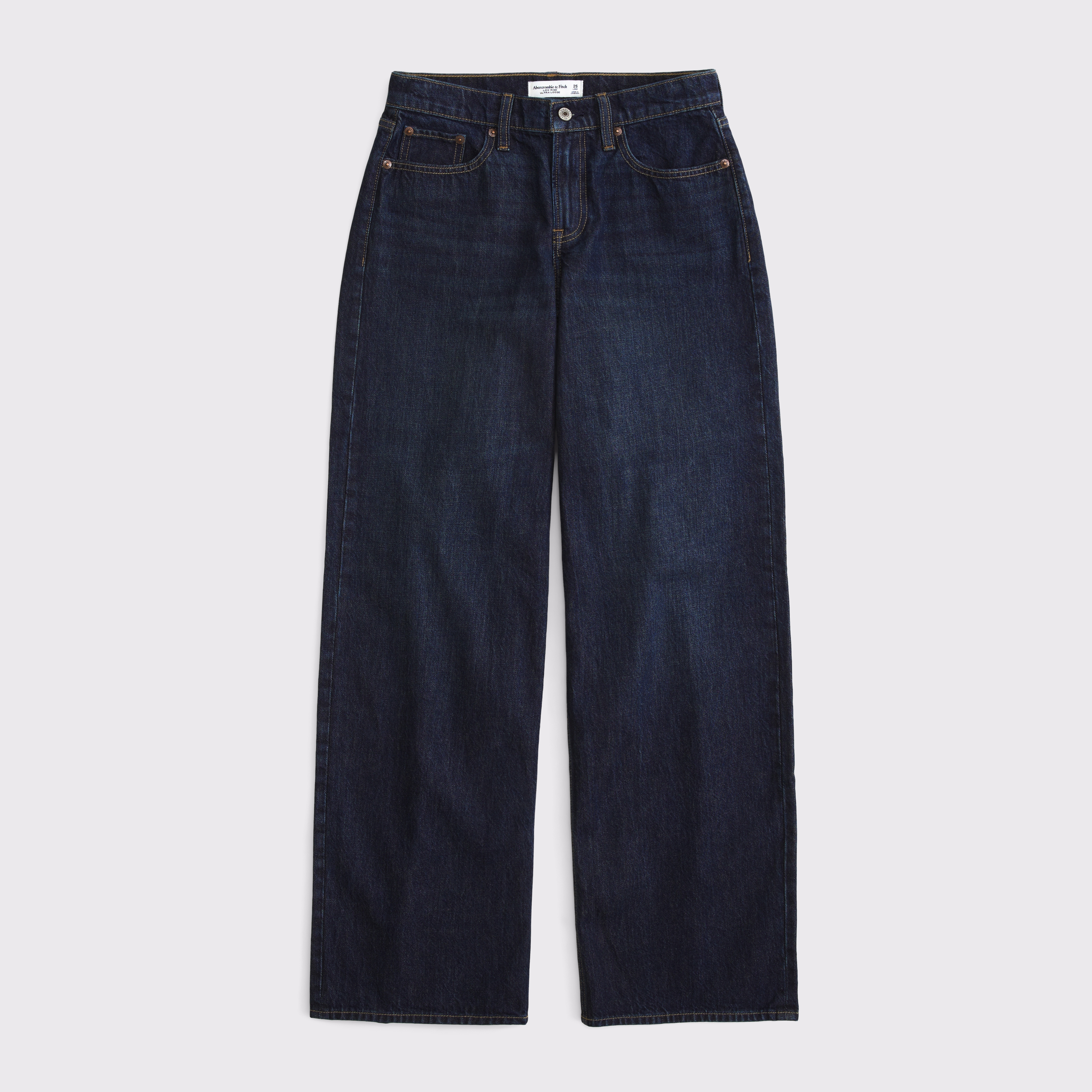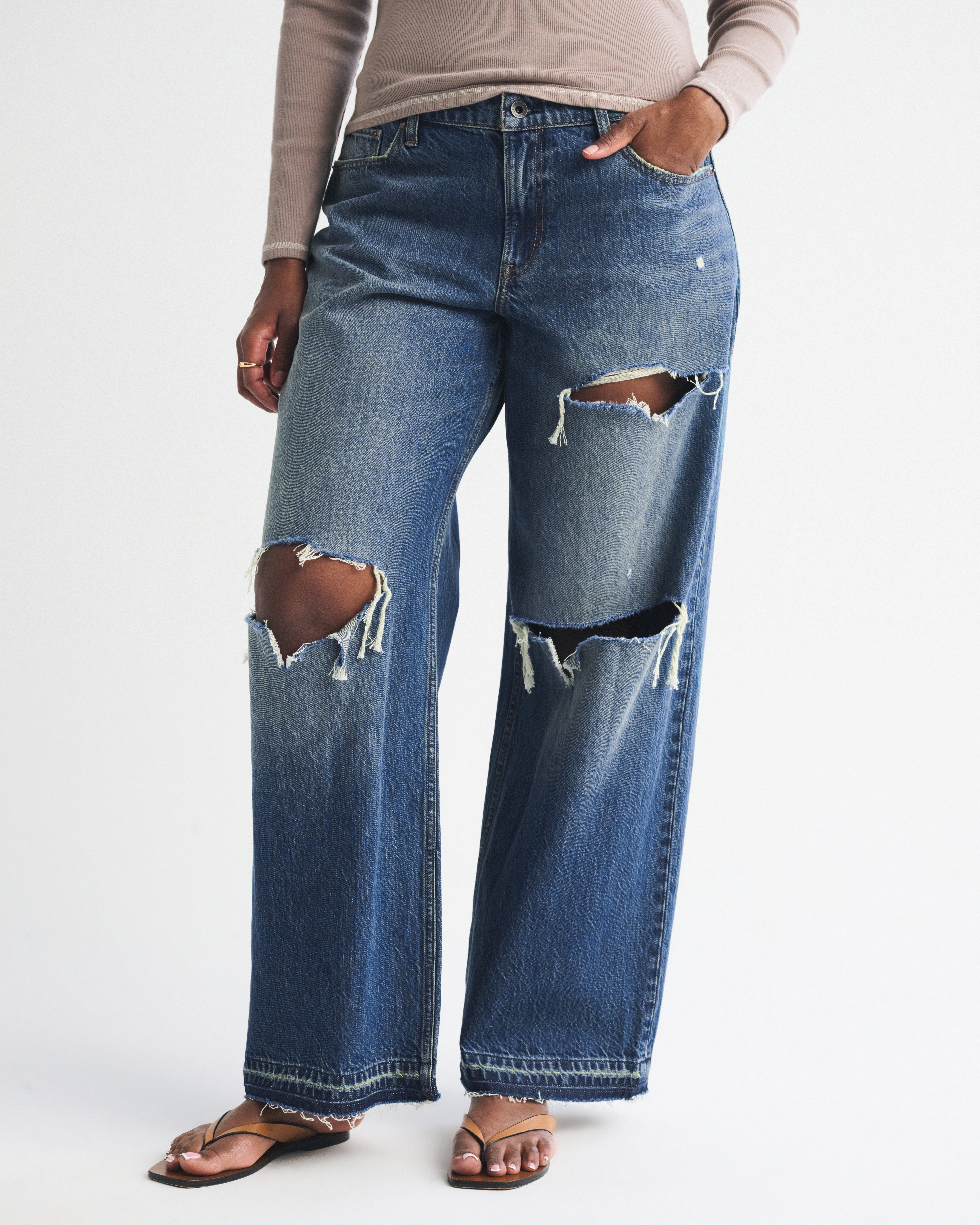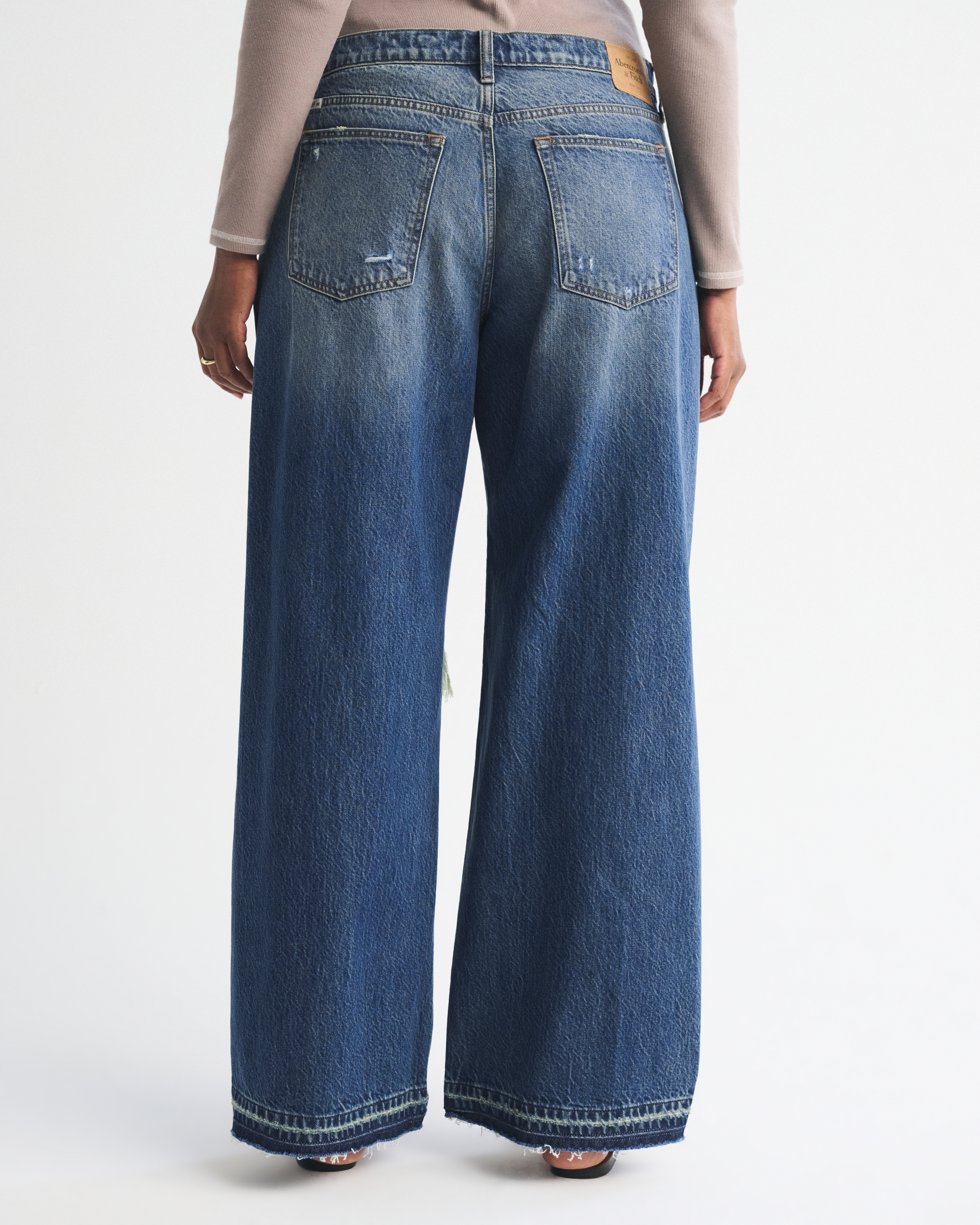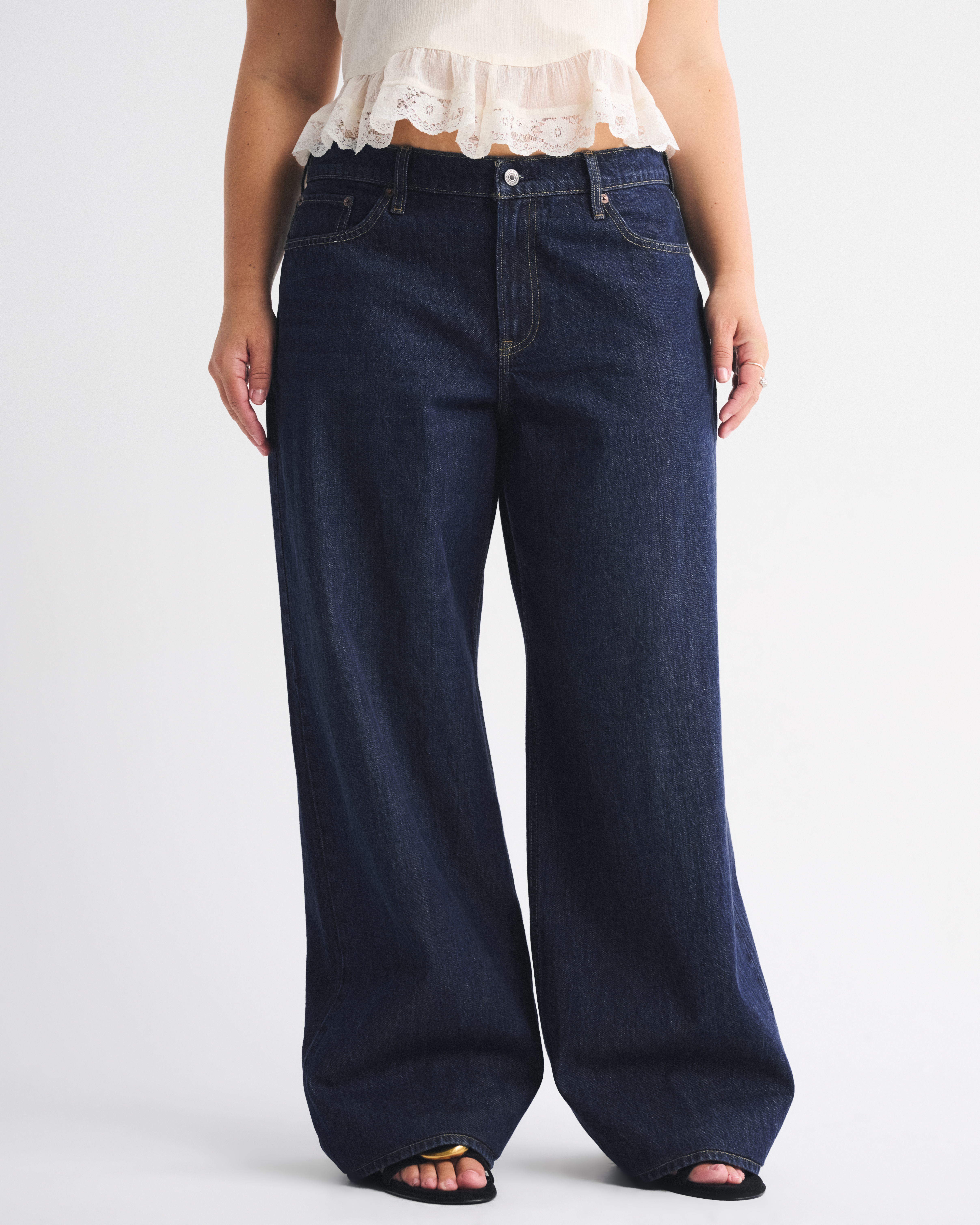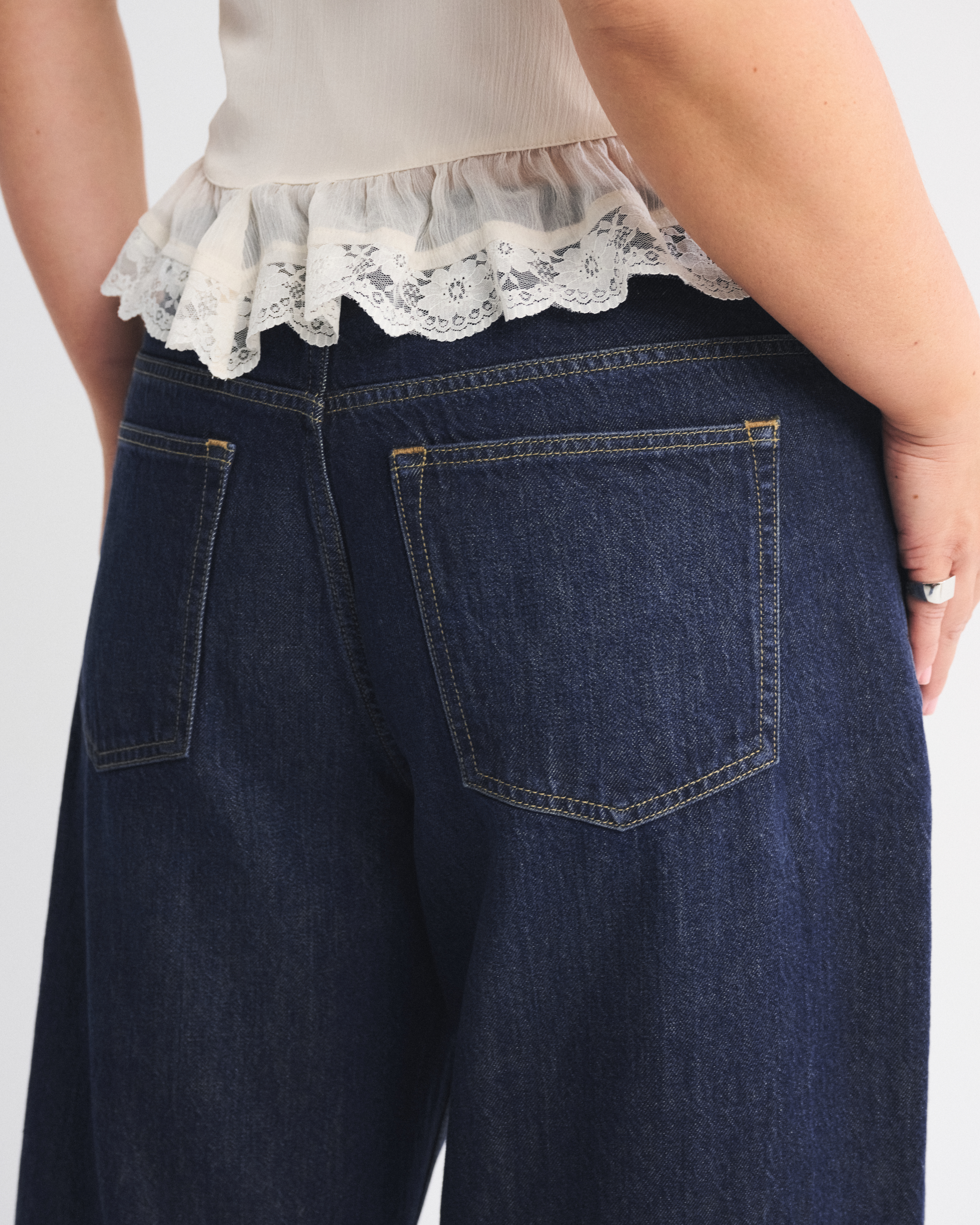 Our Curve Love ultra loose jeans in a dark wash with a cuffed hem. This fit features a low rise, is relaxed at the waist and hips and eases at the thigh into an ultra loose leg shape with a full-length inseam. We recommend buying your true size for a baggier fit. Size down for a closer fit. The viral fit that eliminates waist gap: Curve Love features additional room through the hip and thigh for curve-hugging comfort. This jean is made from our Drapey Rigid denim, a super soft authentic cotton fabric with no stretch. Imported.