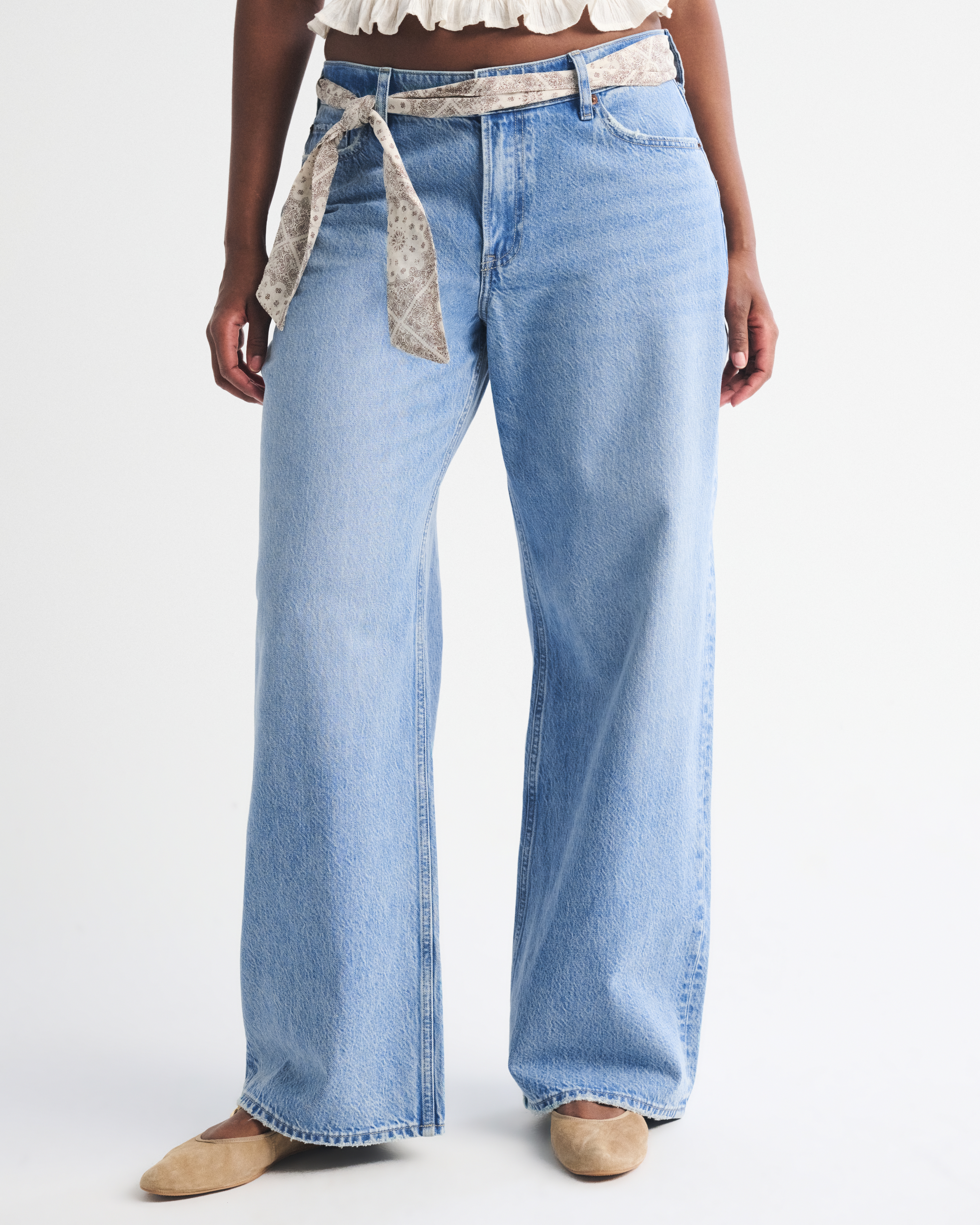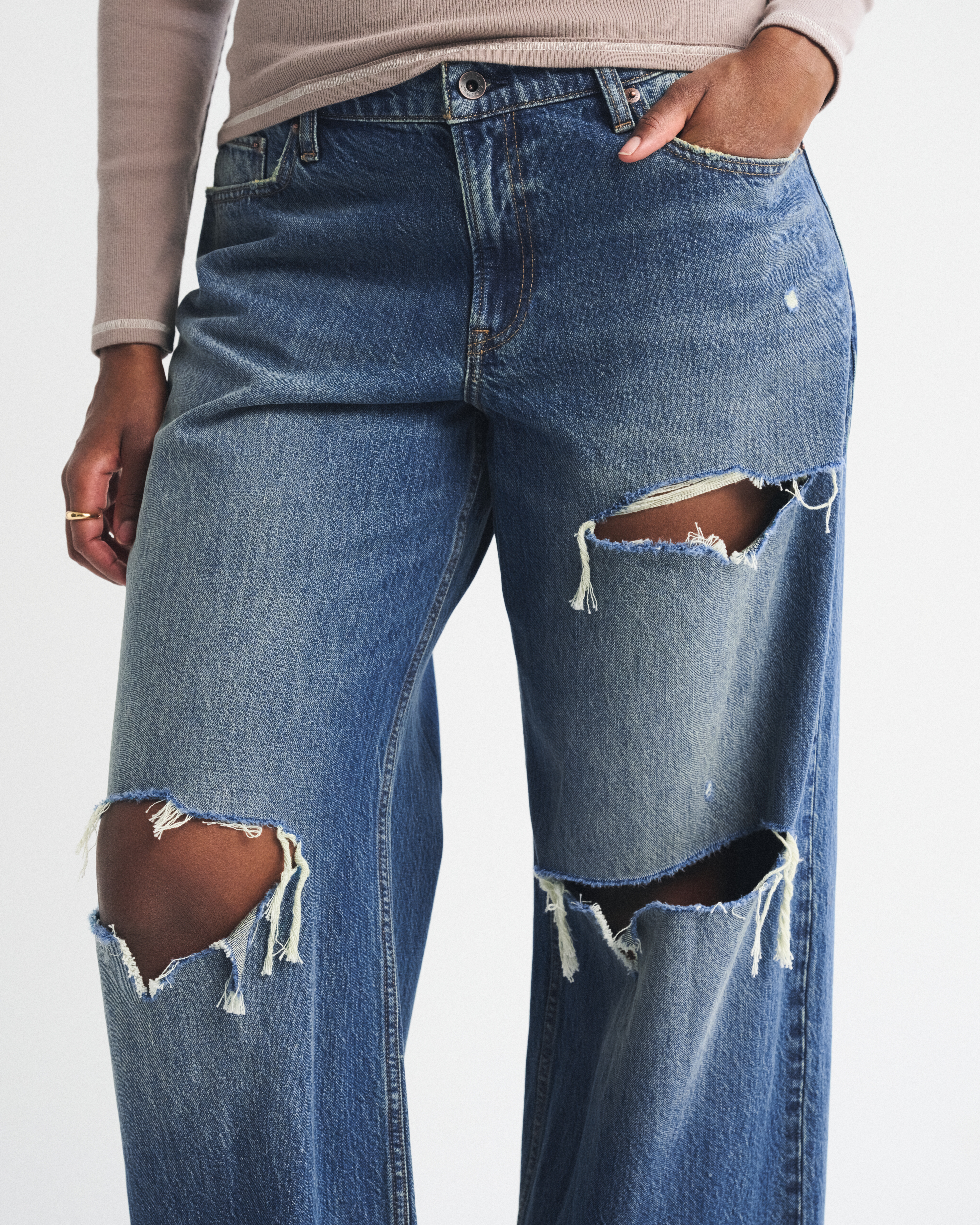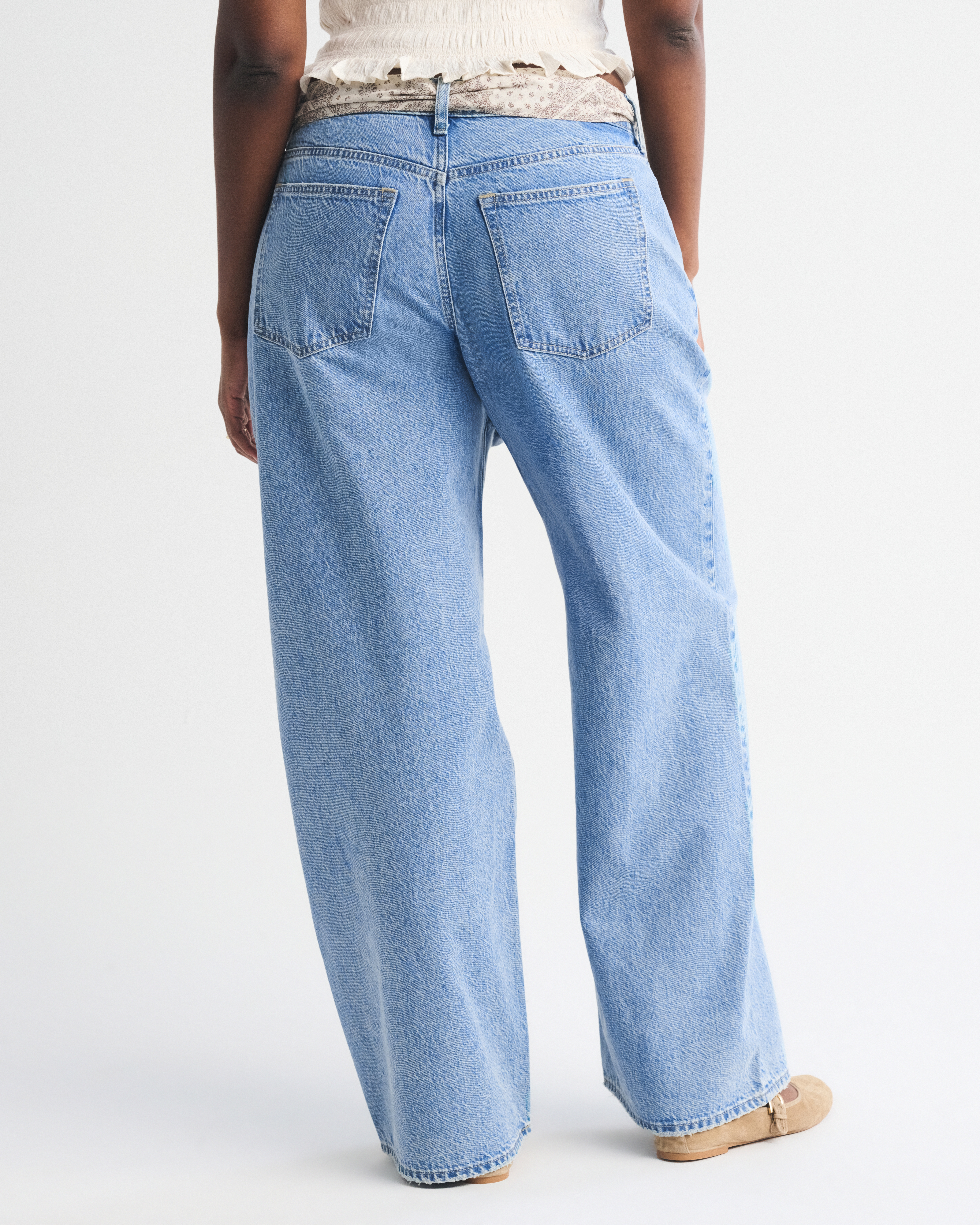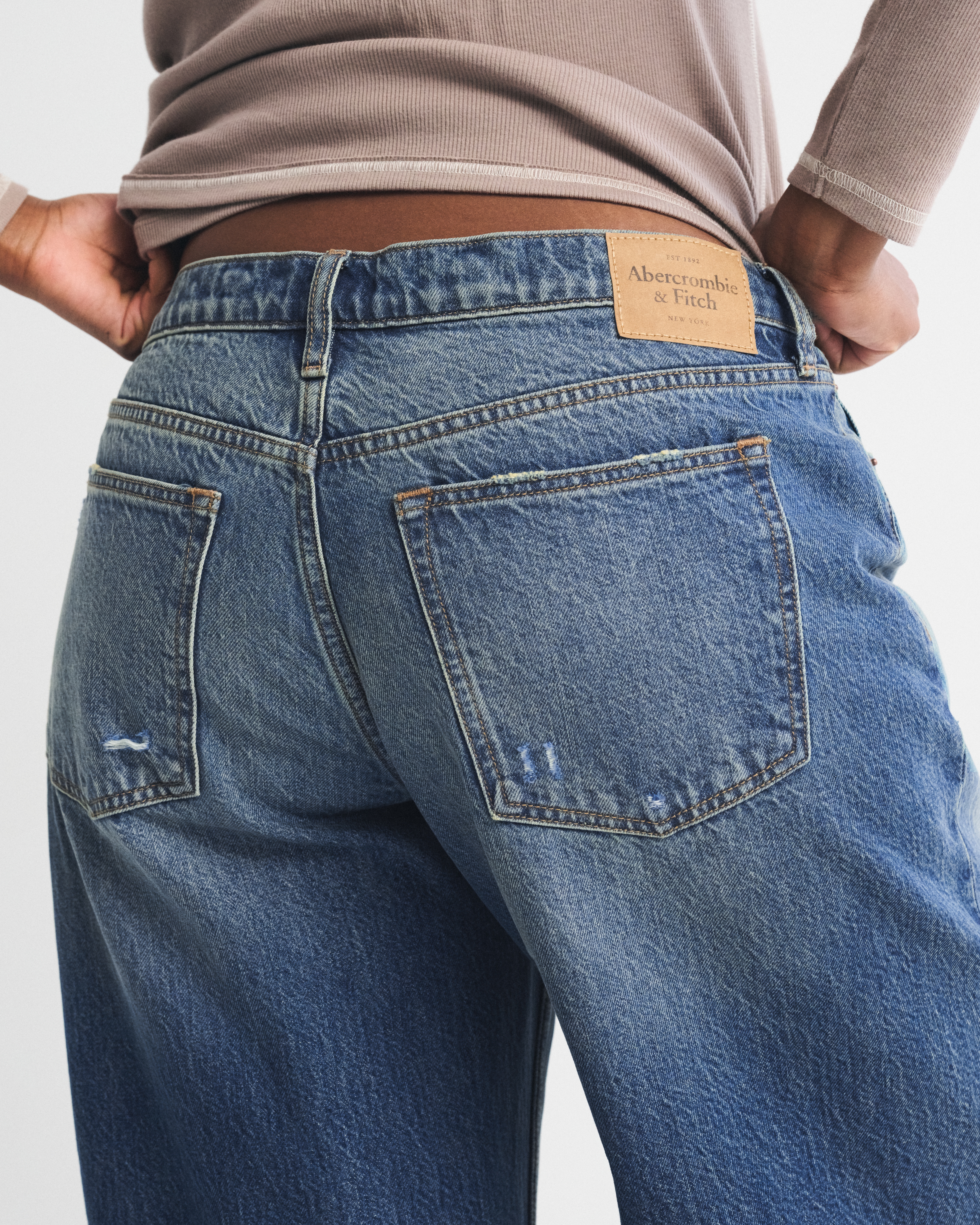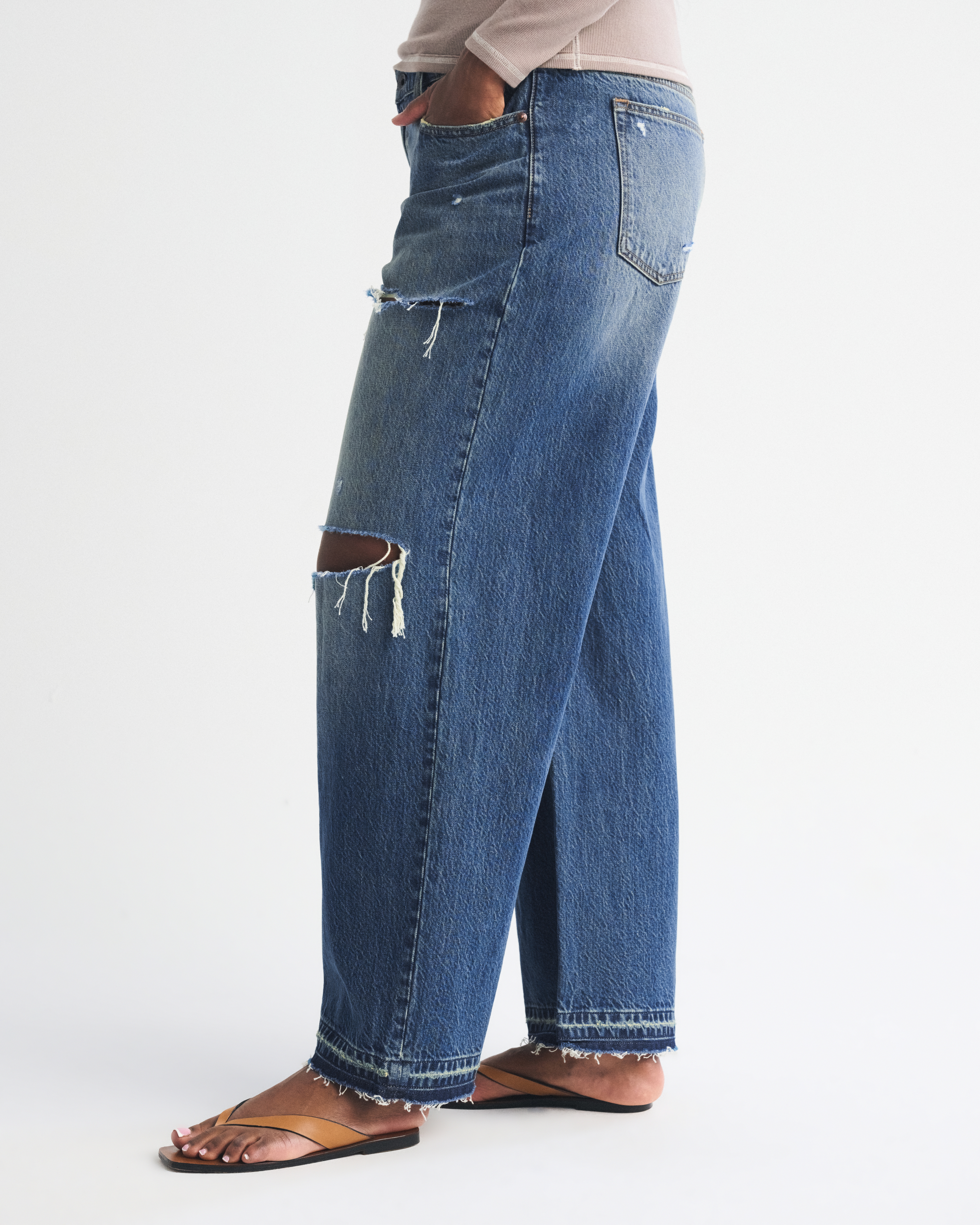 Our Curve Love ultra loose jeans in a dark wash with a cuffed hem. This fit features a low rise, is relaxed at the waist and hips and eases at the thigh into an ultra loose leg shape with a full-length inseam. We recommend buying your true size for a baggier fit. Size down for a closer fit. The viral fit that eliminates waist gap: Curve Love features additional room through the hip and thigh for curve-hugging comfort. This jean is made from our Drapey Rigid denim, a super soft authentic cotton fabric with no stretch. Imported.
