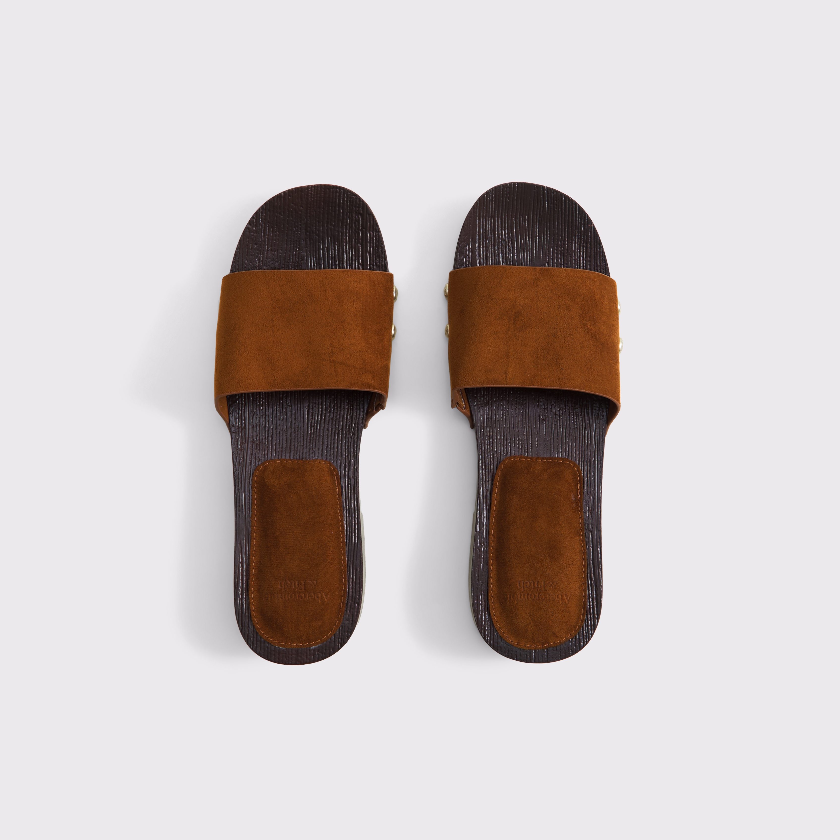 Easy-fitting sandals in a soft vegan suede fabric. Features accented and hammered stud details, a wooden footbed, a padded heel for enhanced comfort, and a vegan suede upper strap. Imported.