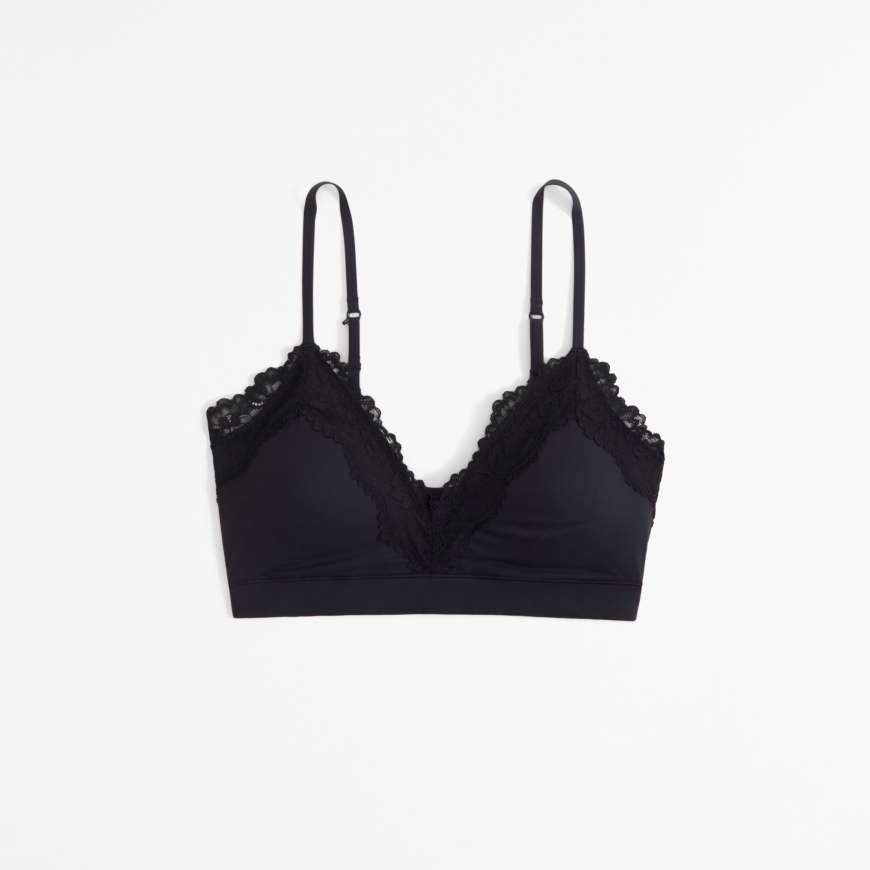 Our fan-favorite super soft triangle bralette in our no-show Next to Naked fabric. Features lace-trim detail at the v-neckline, optional racerback detail, removable pads, bottom band detail and adjustable straps. Imported.