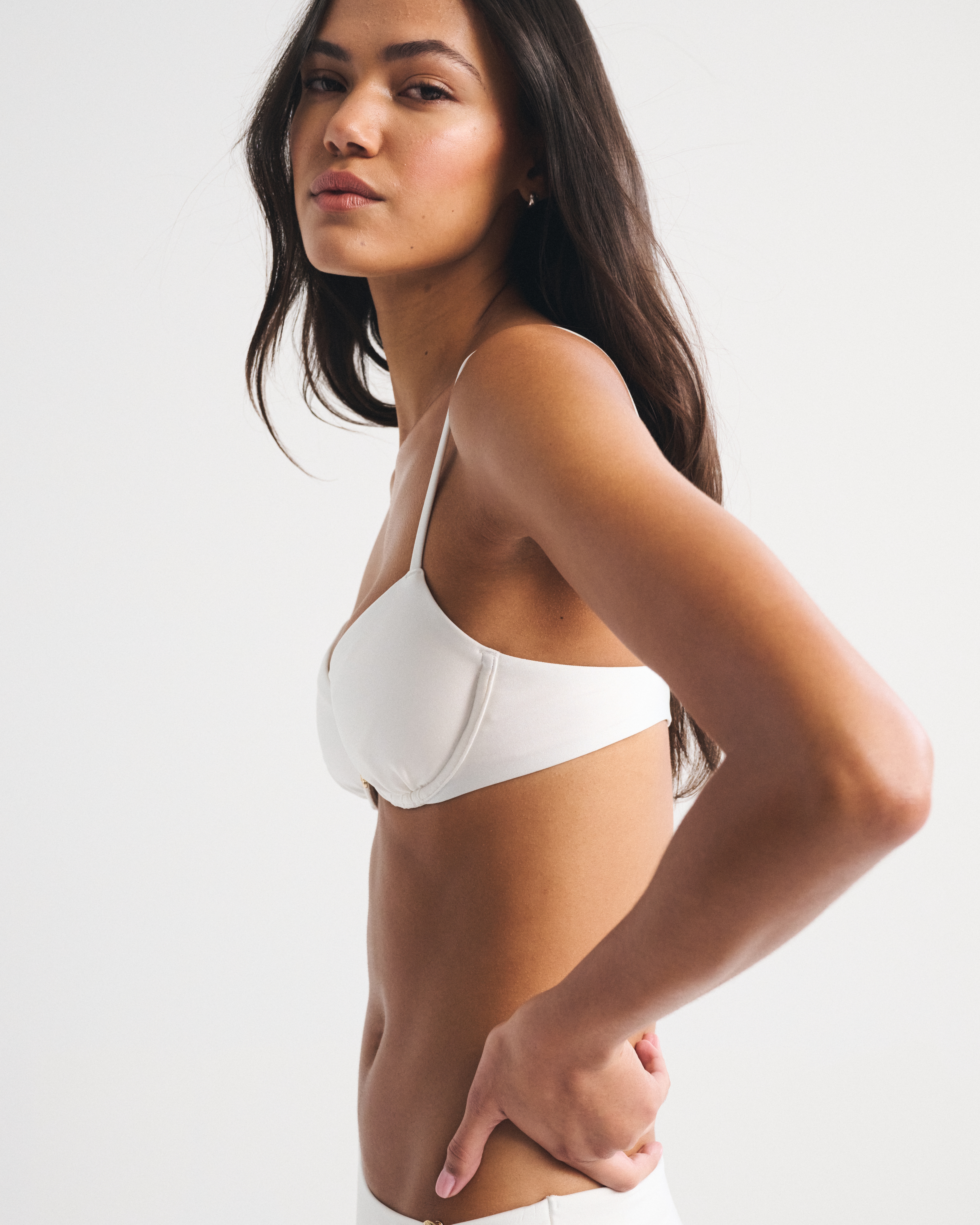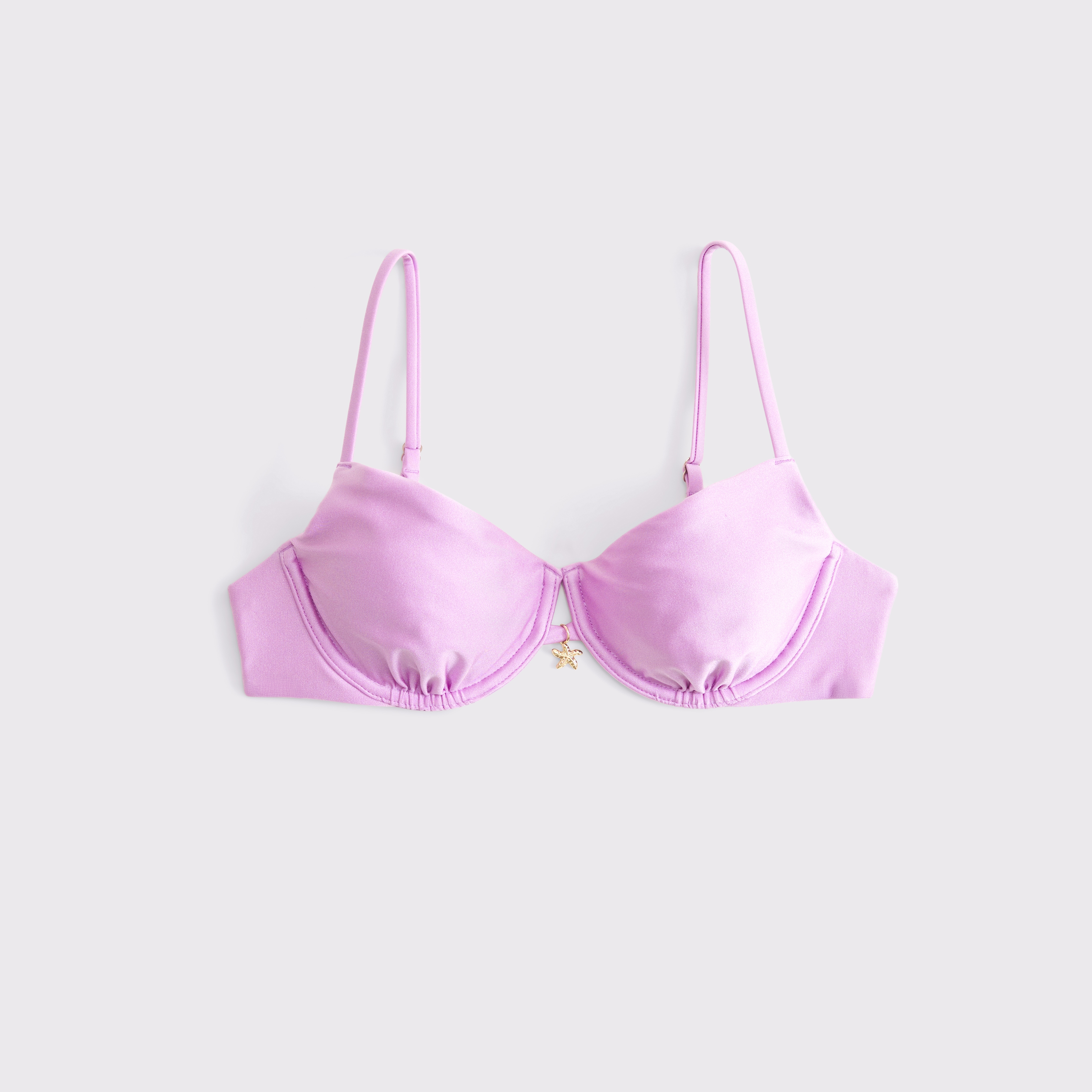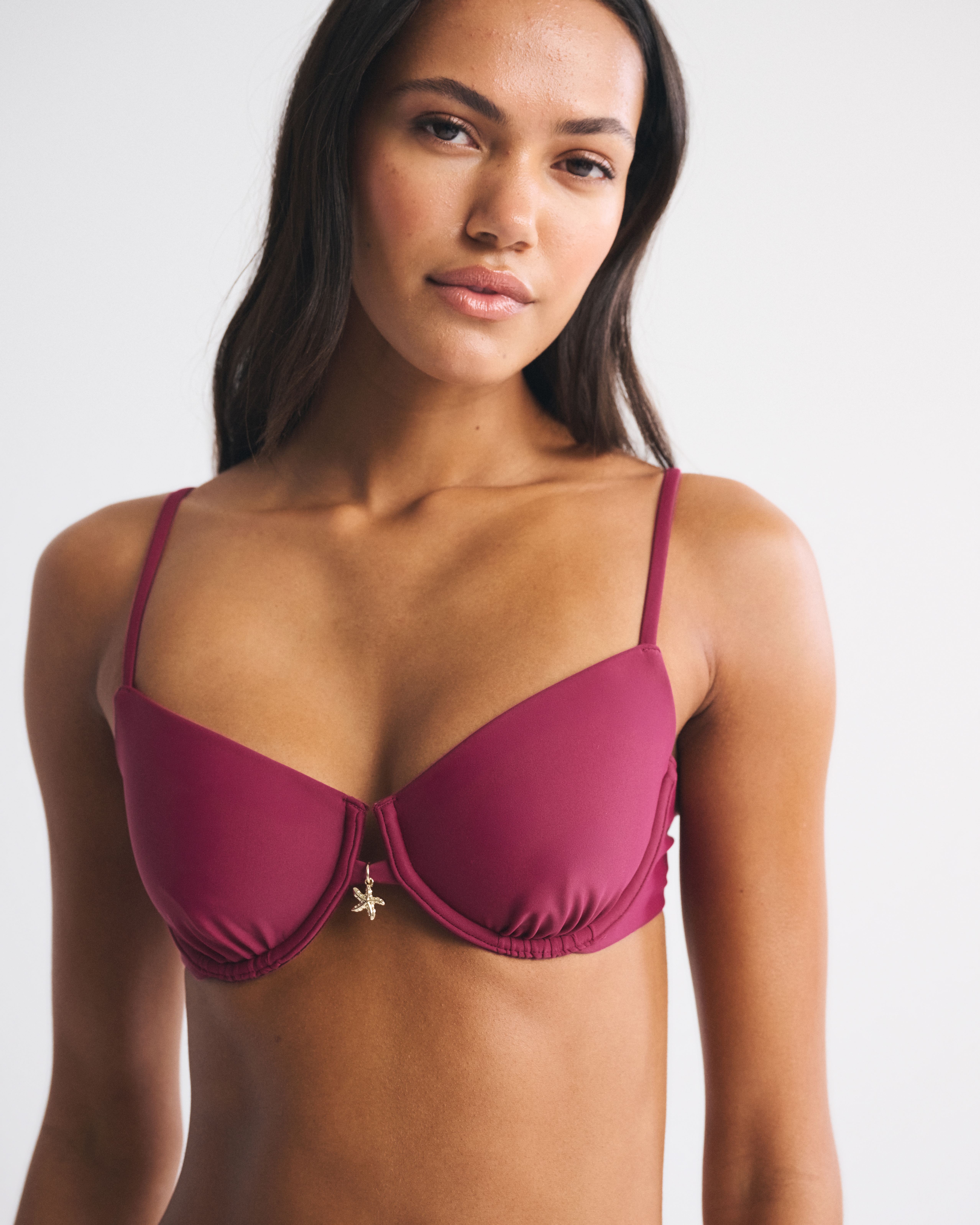 Our underwire bikini top in our core swim fabric. Features unlined cups, a flattering balconette-shaped neckline, adjustable straps and a back hook detail. Imported.