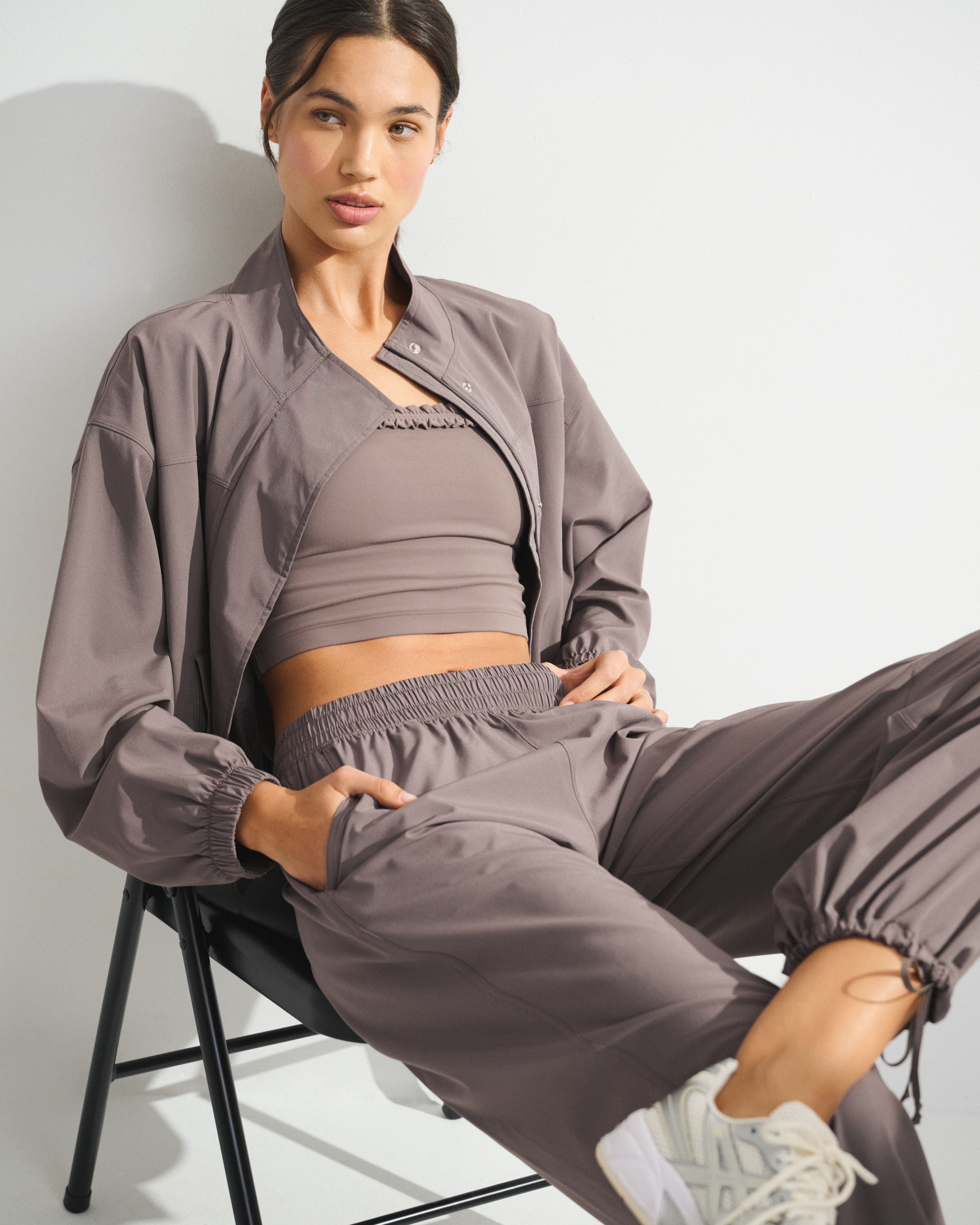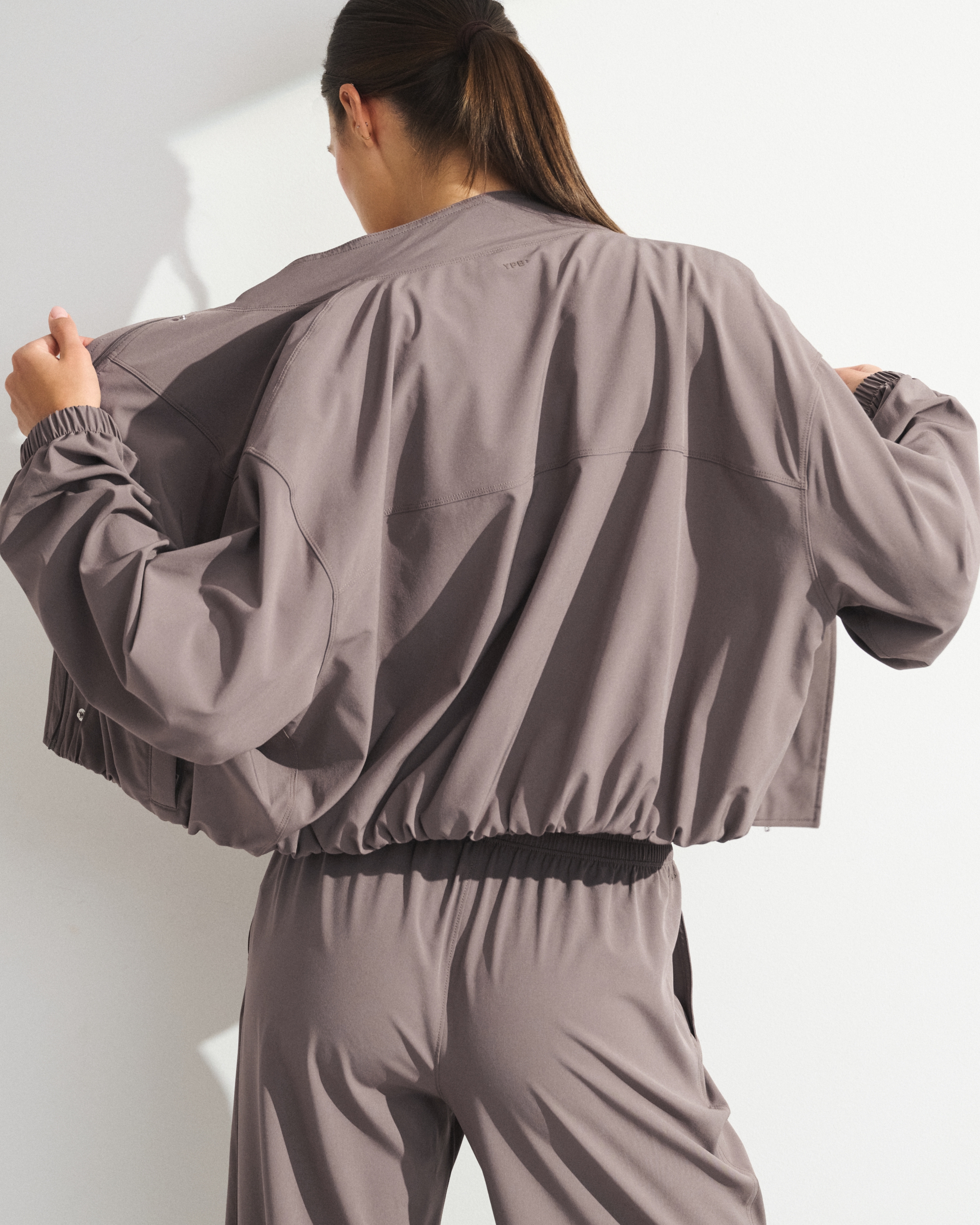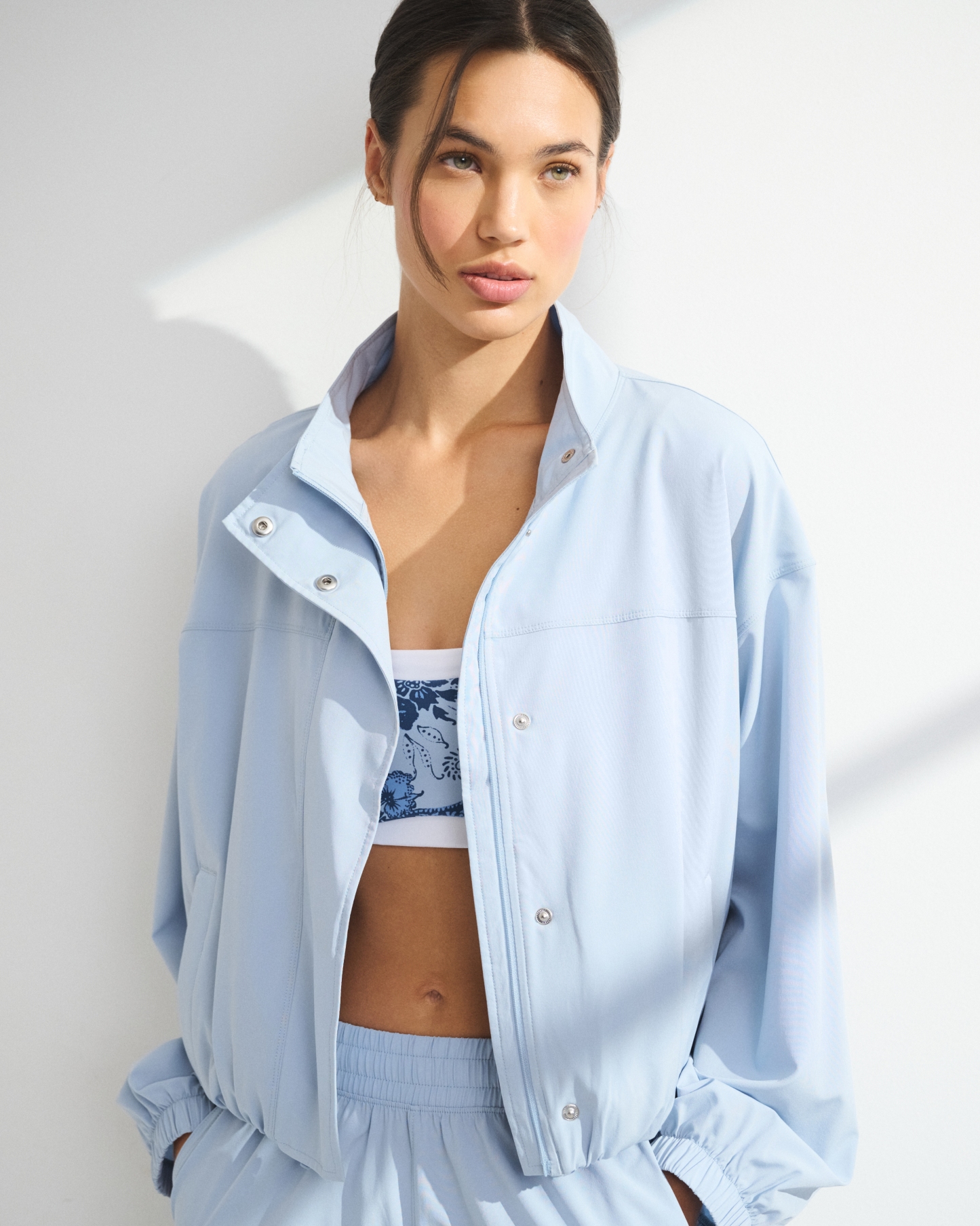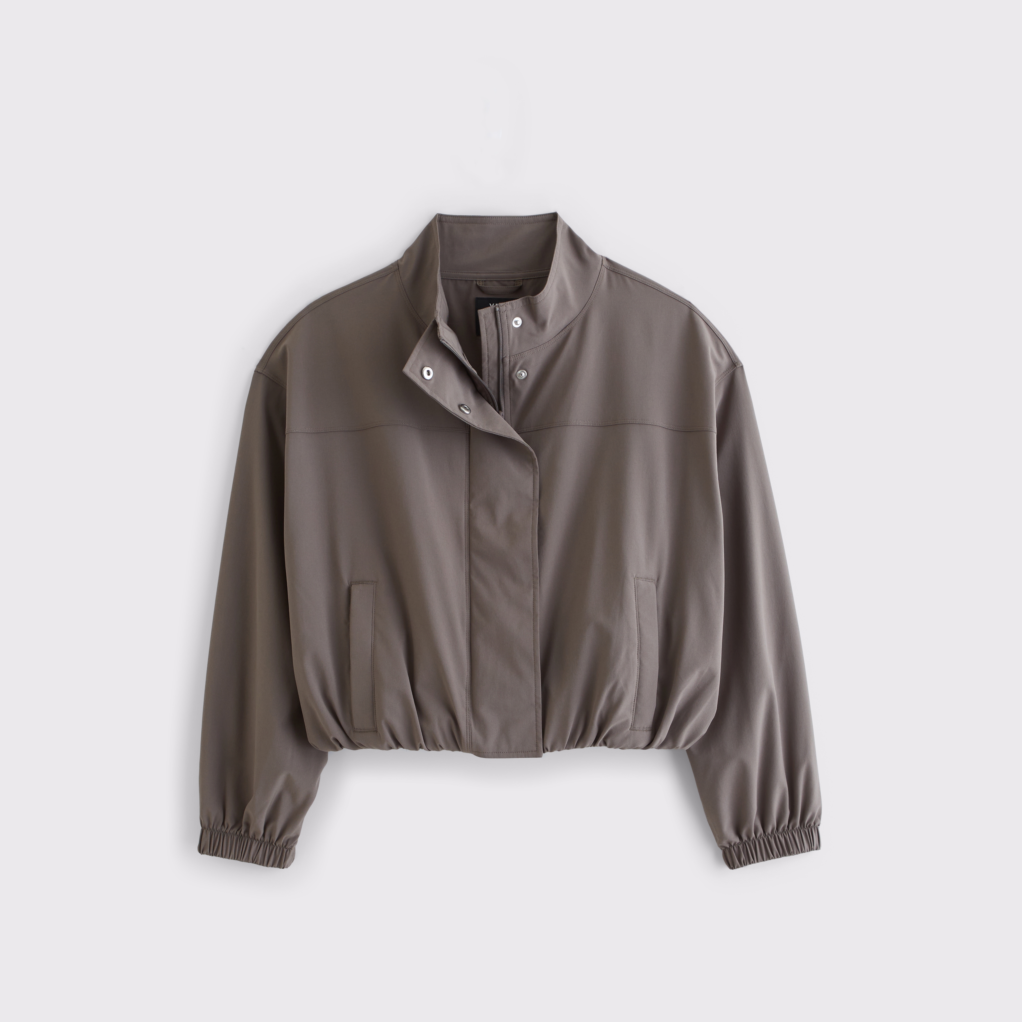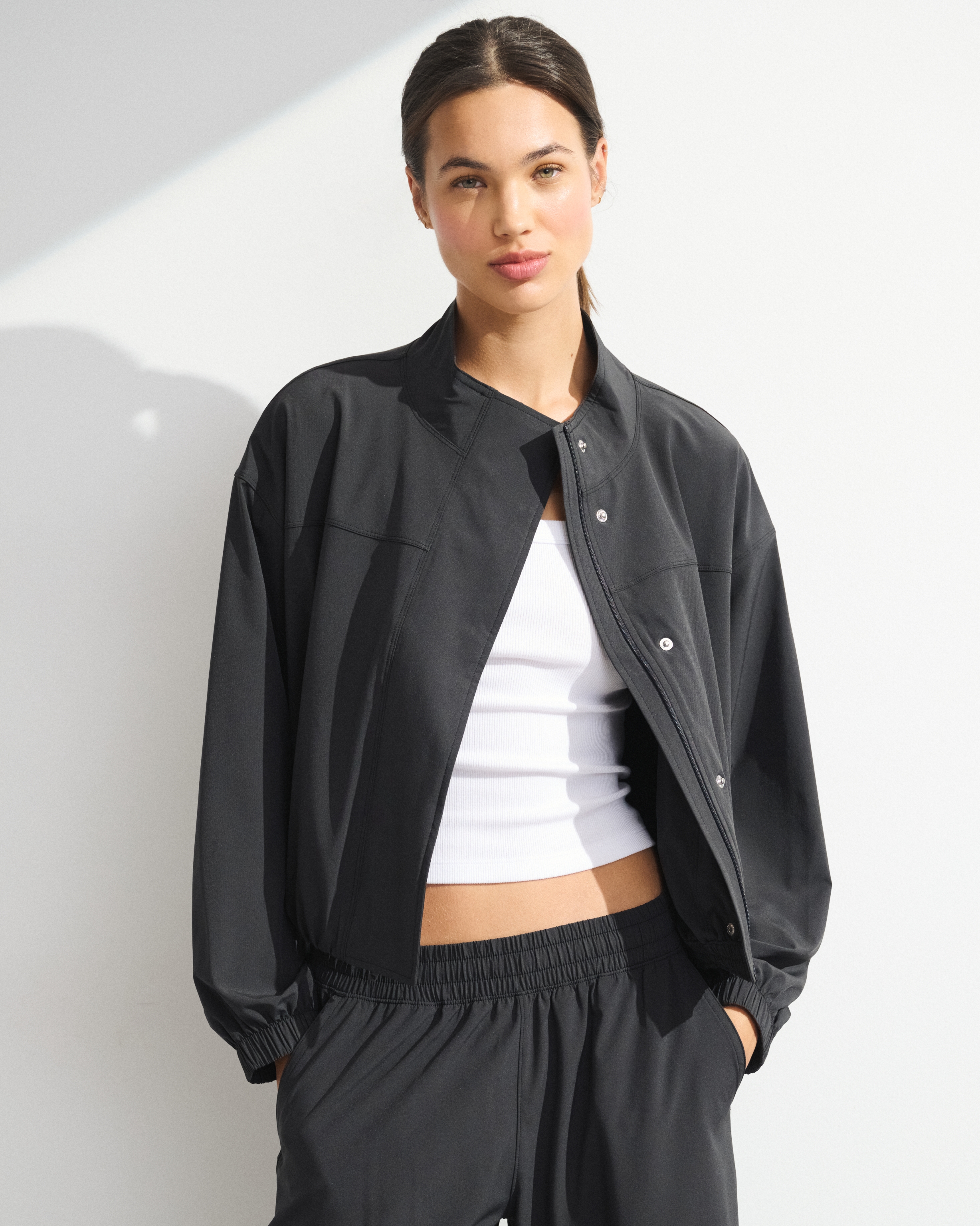 Our easy-fitting jacket in our lightweight motionTEK active fabric. Designed to move with you, our motionTEK fabric is lightweight, stretchy and breathable. Features an easy silhouette, a high-neck collar, zip- and snap-up front, pockets and a cinched hem and cuffs. Perfect to throw on over YPB sets pre- or post-workout. Imported.