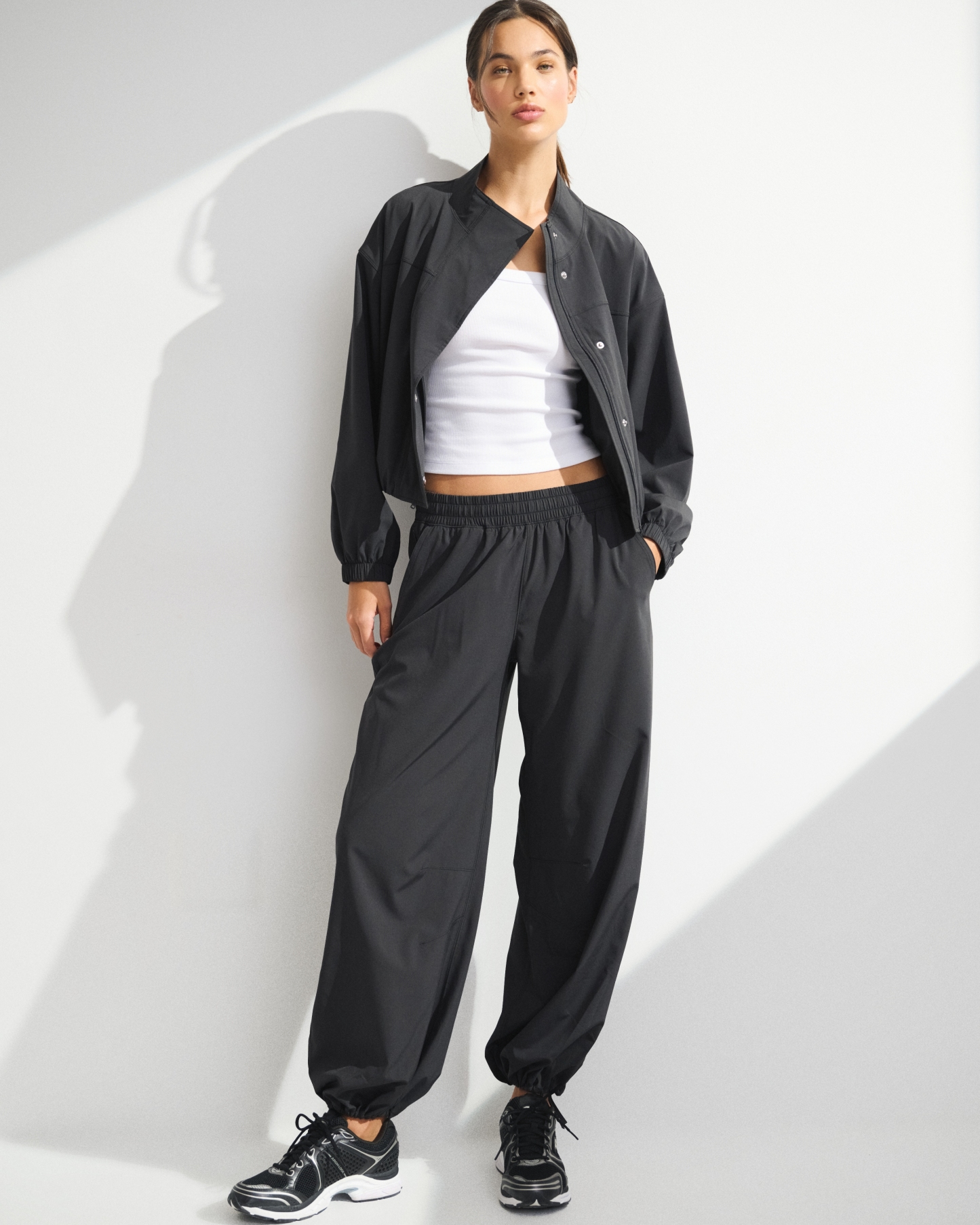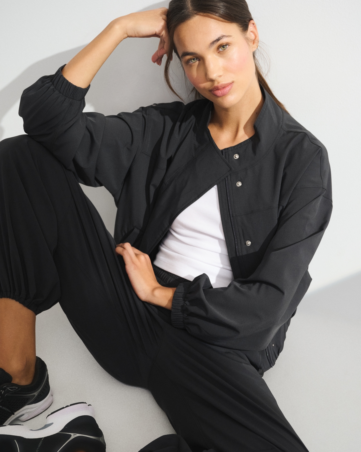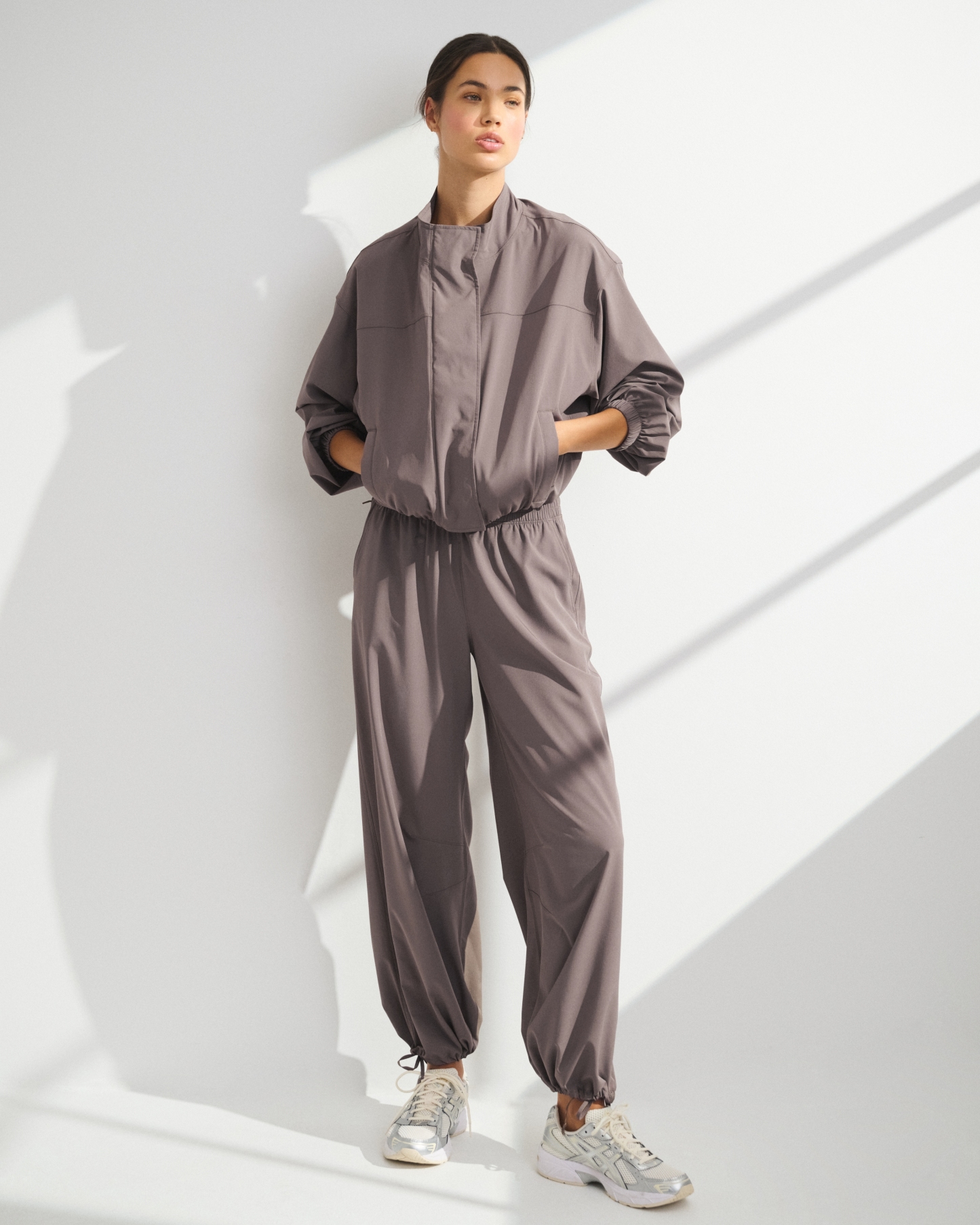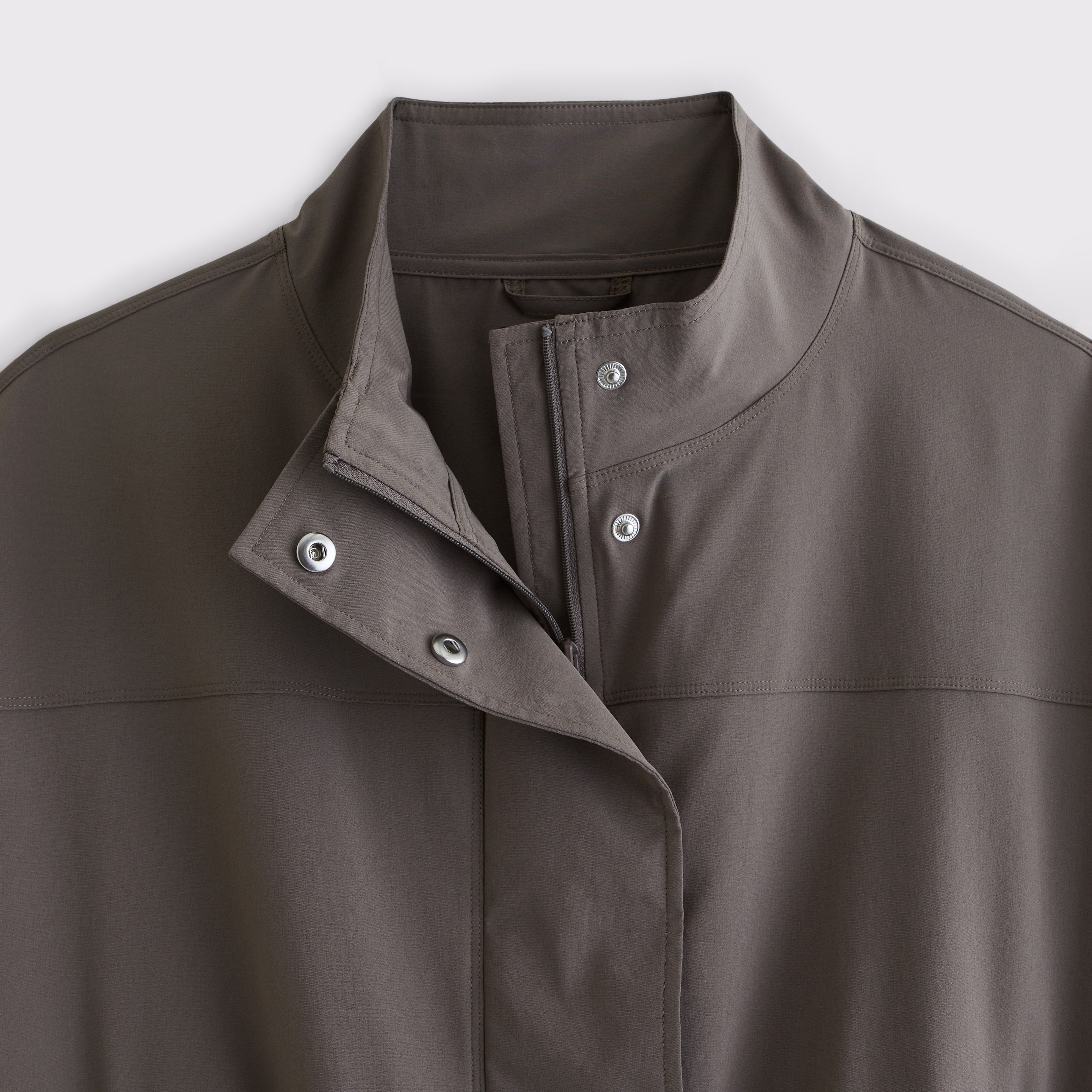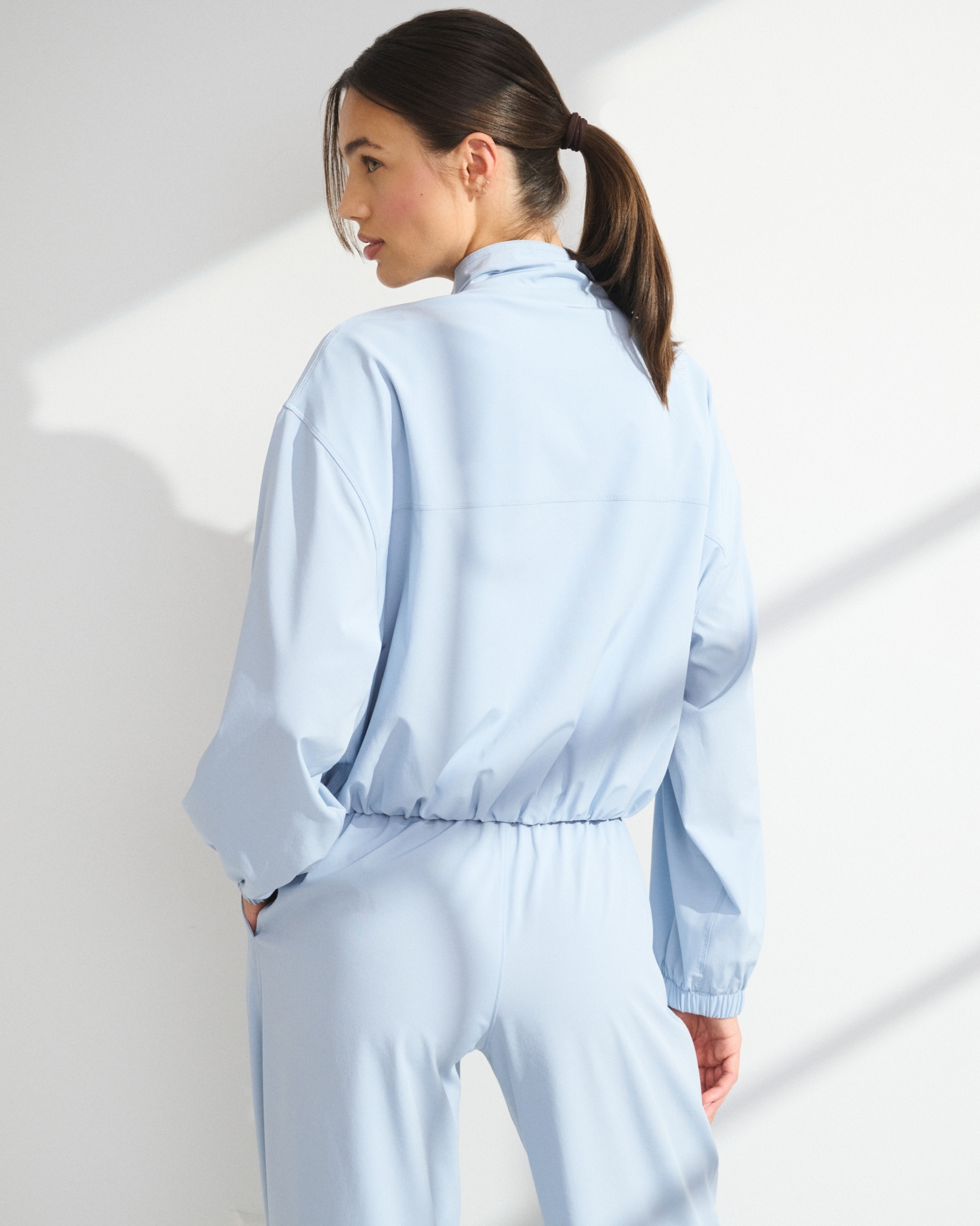 Our easy-fitting jacket in our lightweight motionTEK active fabric. Designed to move with you, our motionTEK fabric is lightweight, stretchy and breathable. Features an easy silhouette, a high-neck collar, zip- and snap-up front, pockets and a cinched hem and cuffs. Perfect to throw on over YPB sets pre- or post-workout. Imported.